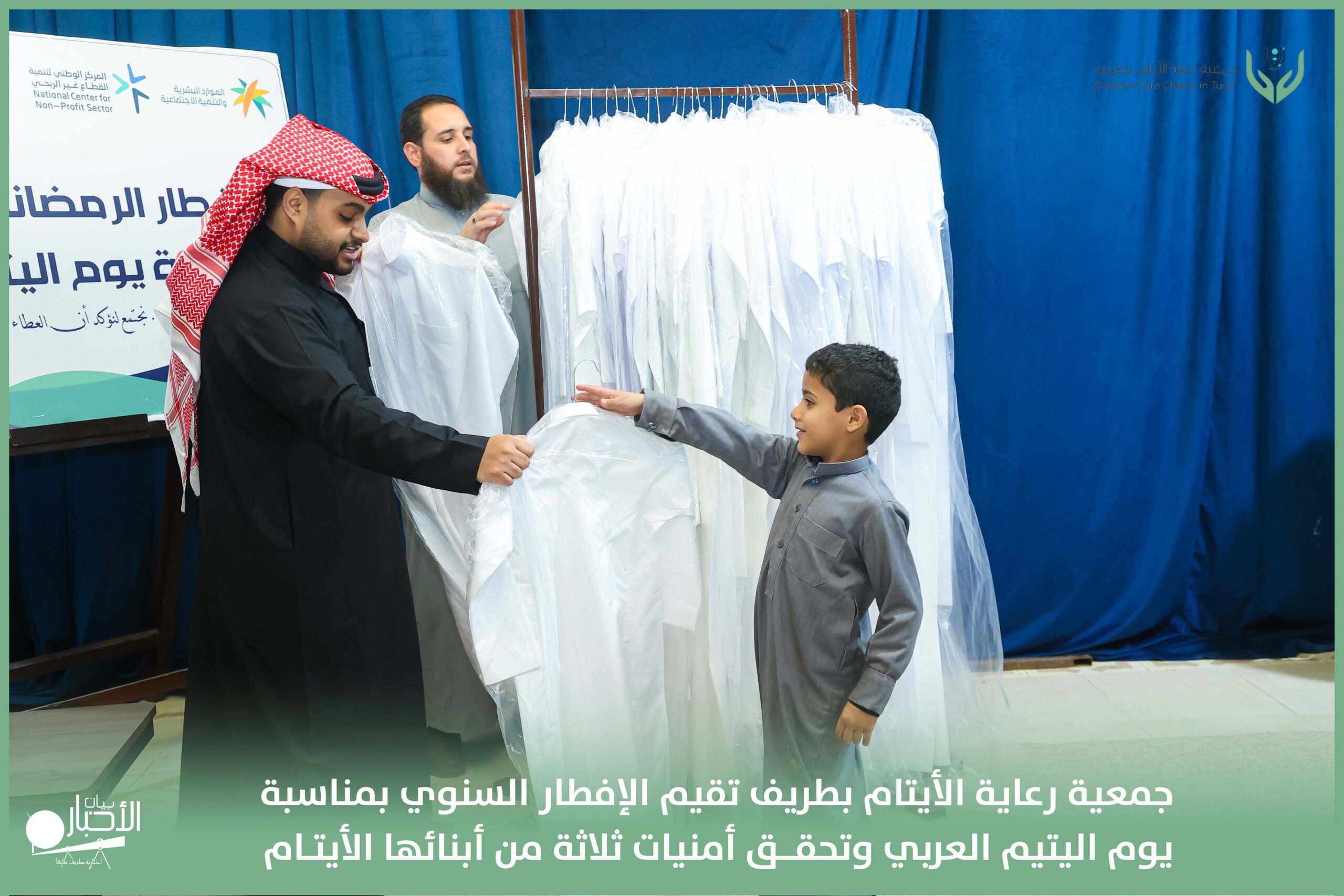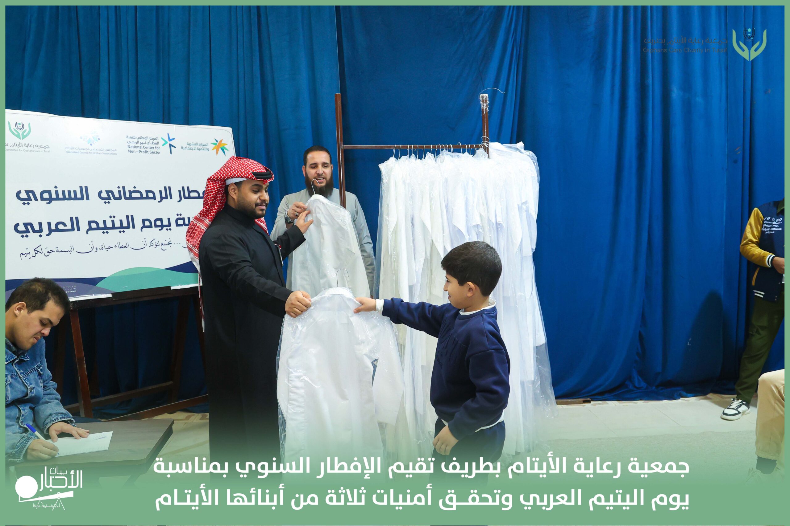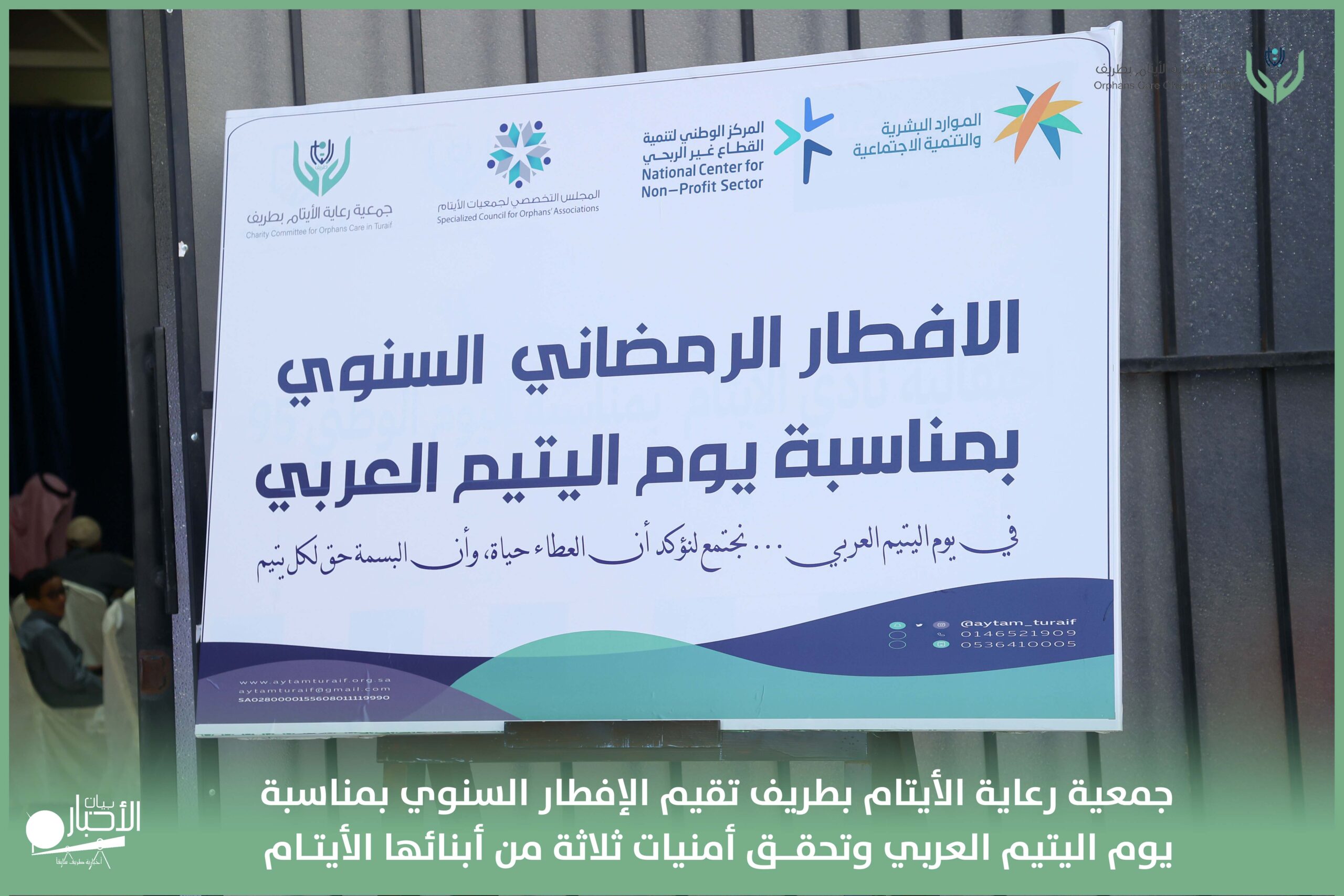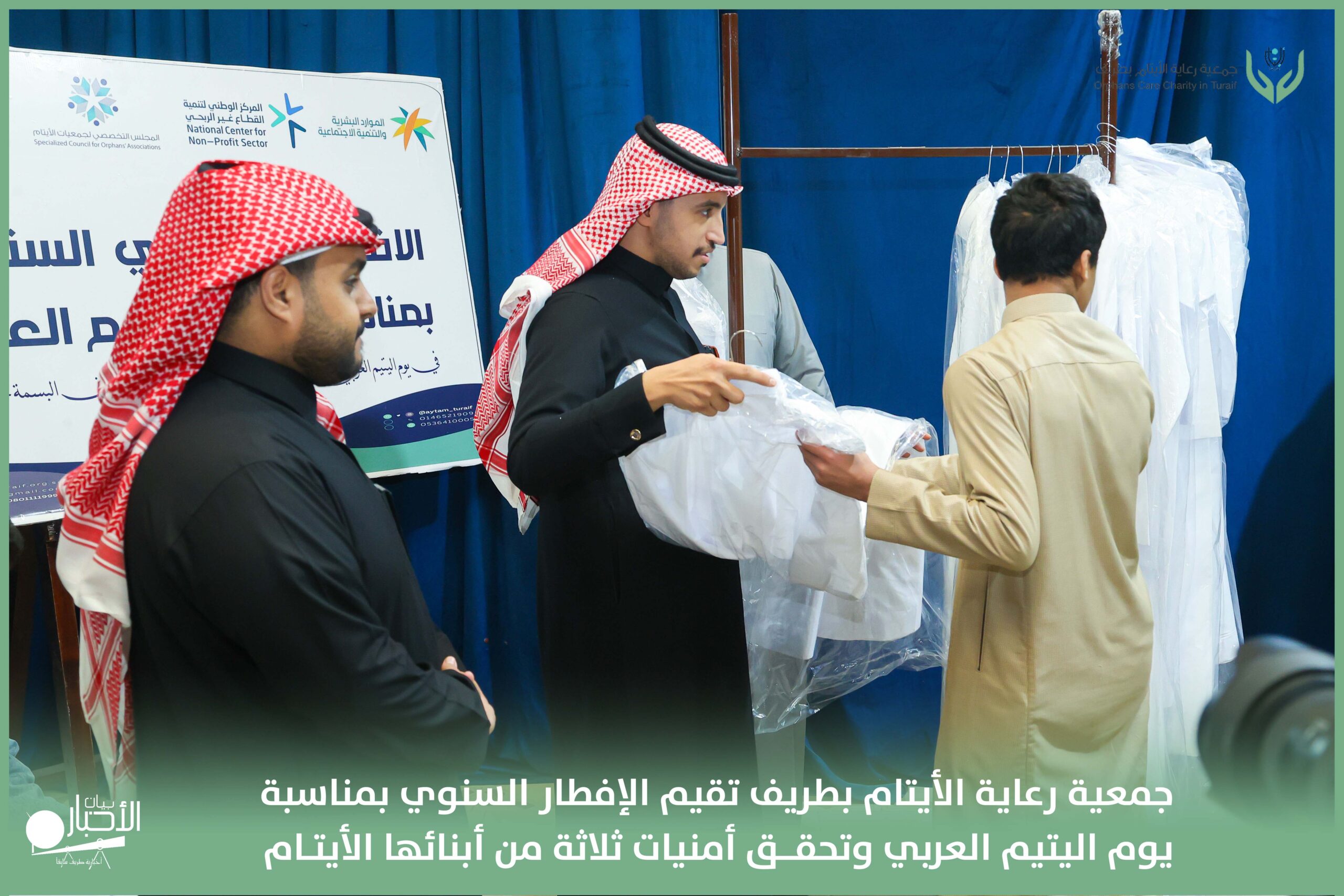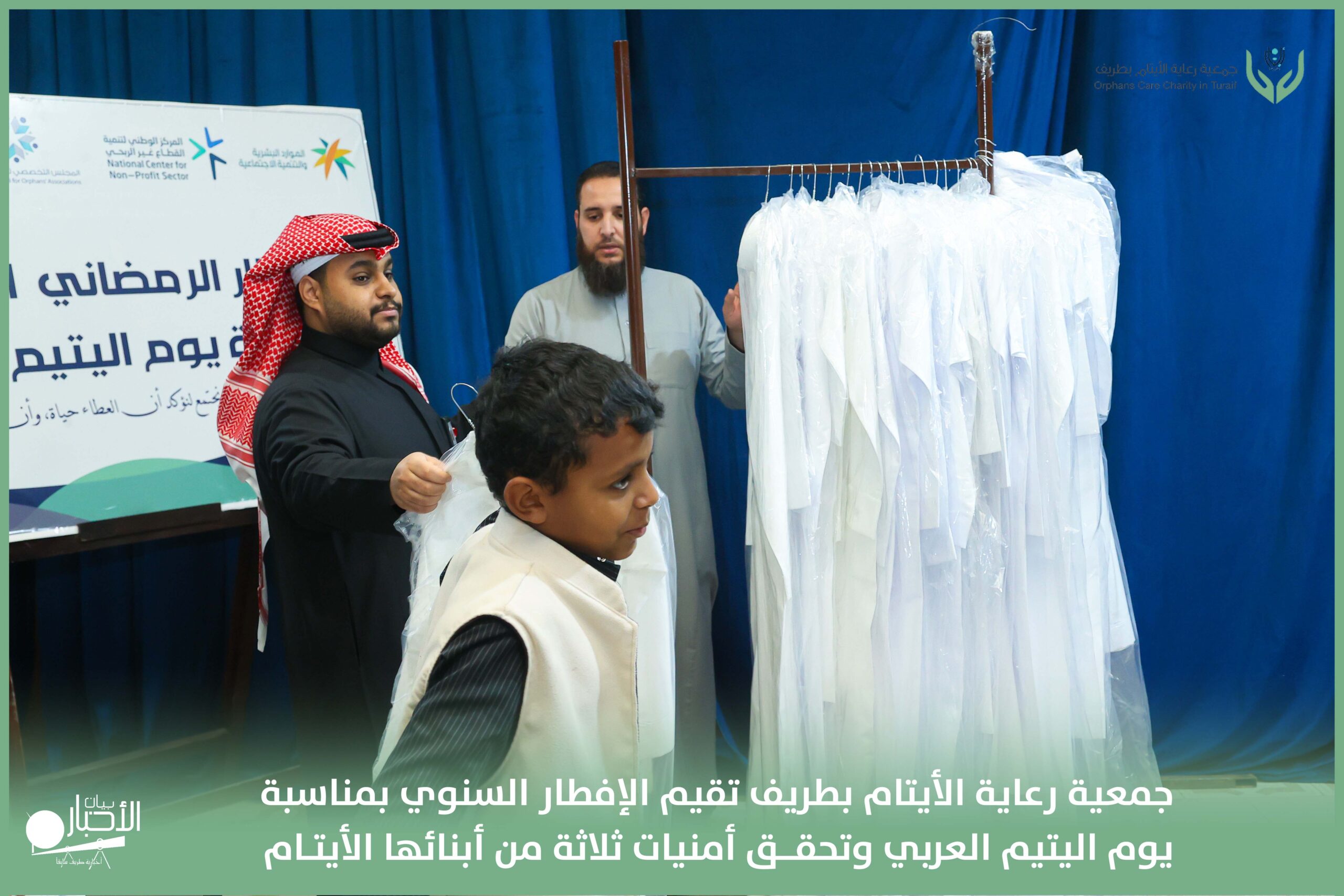 أقامت جمعية رعاية الأيتام بطريف مساء اليوم الجمعة 17 رمضان 1447هـ، حفل الإفطار السنوي بمناسبة يوم اليتيم العربي، وذلك بمقر مدرسة الوعد النموذجية الأهلية المتوسطة والثانوية، بحضور عدد من أعضاء مجلس الإدارة، والإدارة التنفيذية بالجمعية، وعدد من الضيوف والحضور الكرام من ابنائها الايتام