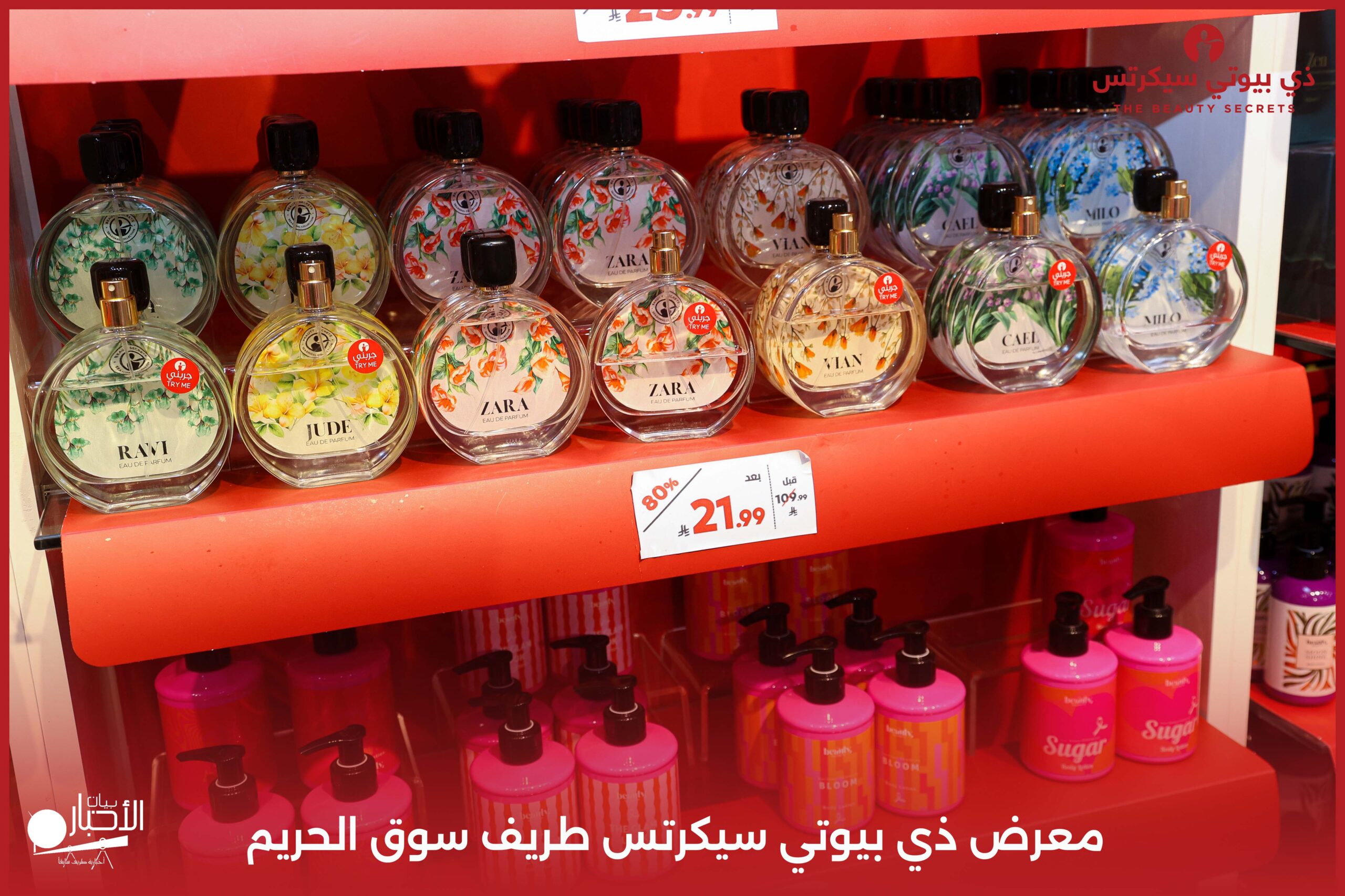 كما يضم المعرض تشكيلة كبيرة من العطور الموسمية بروائح متنوعة تناسب مختلف الأذواق، بخصومات تتراوح بين 70% و80%، إذ انخفضت بعض الأسعار من 129.99 ريال إلى 25.99 ريال، وأخرى من 109.99 ريال إلى 21.99 ريال.