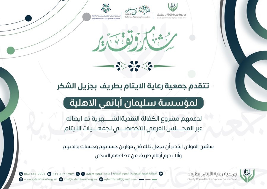 جمعية رعاية الأيتام بطريف تشكر مؤسسة سليمان أبانمي الأهلية لدعمها مشروع الكفالة النقدية