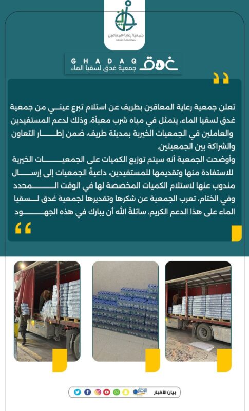 أعلنت جمعية رعاية المعاقين بمحافظة طريف عن استلام تبرع عيني من جمعية غدق لسقيا الماء، تمثل في كميات من مياه الشرب المعبأة، وذلك لدعم المستفيدين والعاملين في الجمعيات الخيرية بمحافظة طريف، ضمن إطار التعاون والشراكة بين الجهات الخيرية.