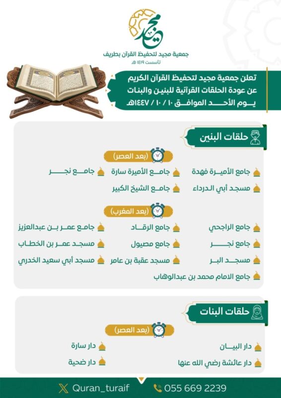 • 27/03/2026 جمعية مجيد لتحفيظ القرآن الكريم بطريف تعلن عودة الحلقات القرآنية للبنين والبنات