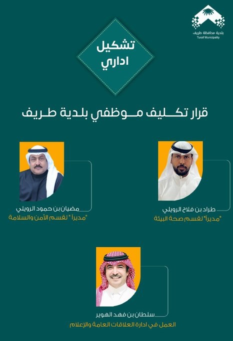 وشملت القرارات تكليف كلٍ من مضيان بن حمود الرويلي مديرًا لقسم الأمن والسلامة، وطراد بن فلاح الرويلي مديرًا لقسم صحة البيئة، إلى جانب تكليف سلطان بن فهد الهوير بالعمل في إدارة العلاقات العامة والإعلام.