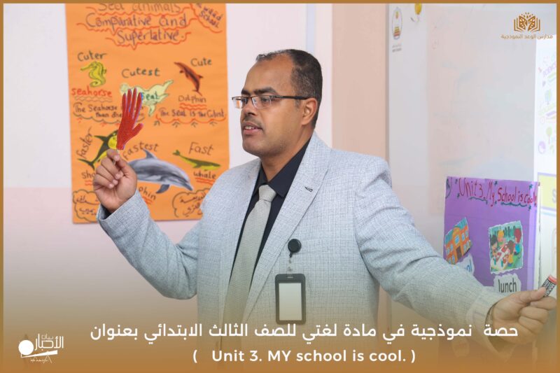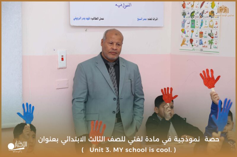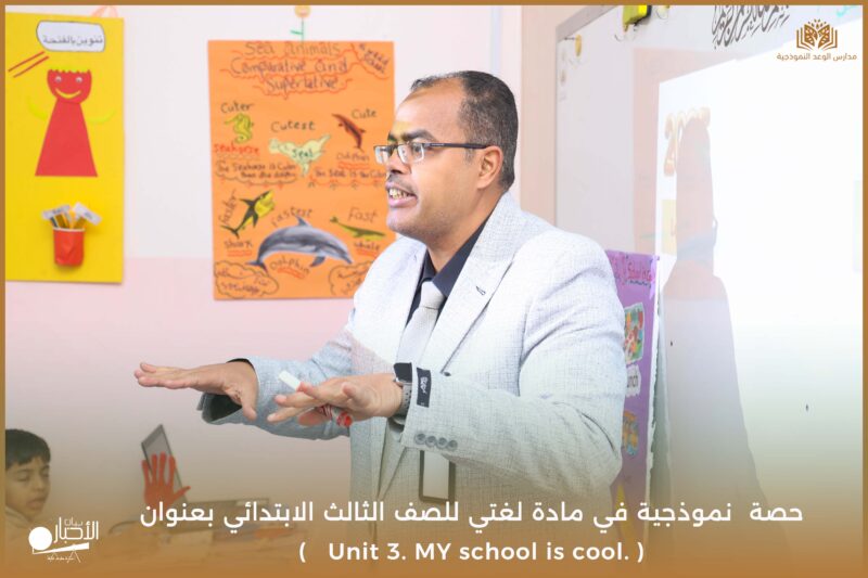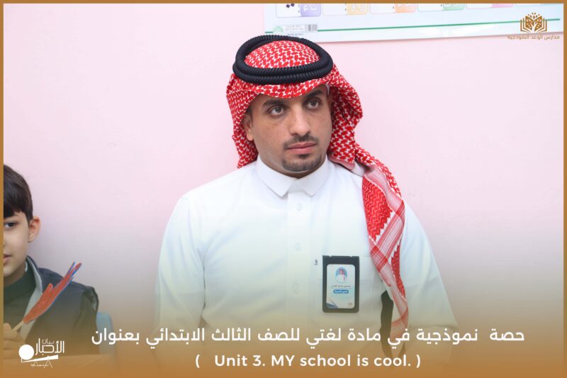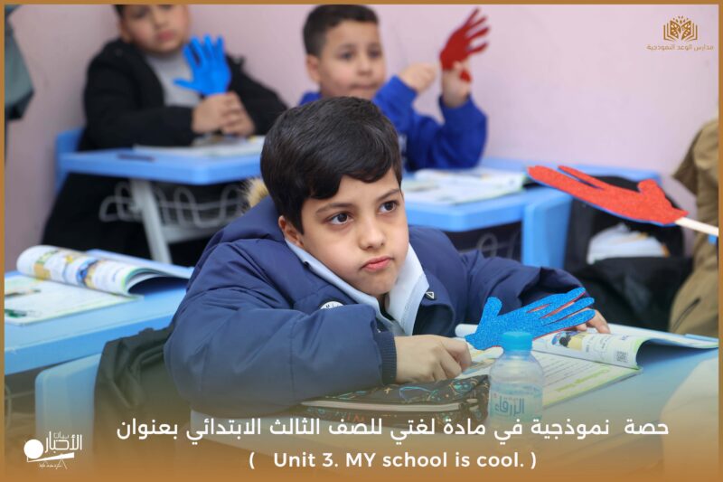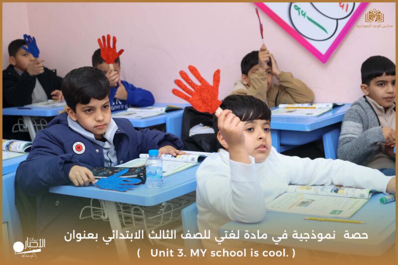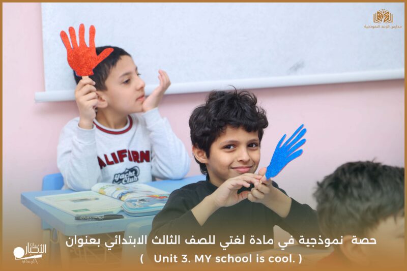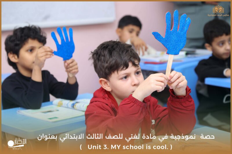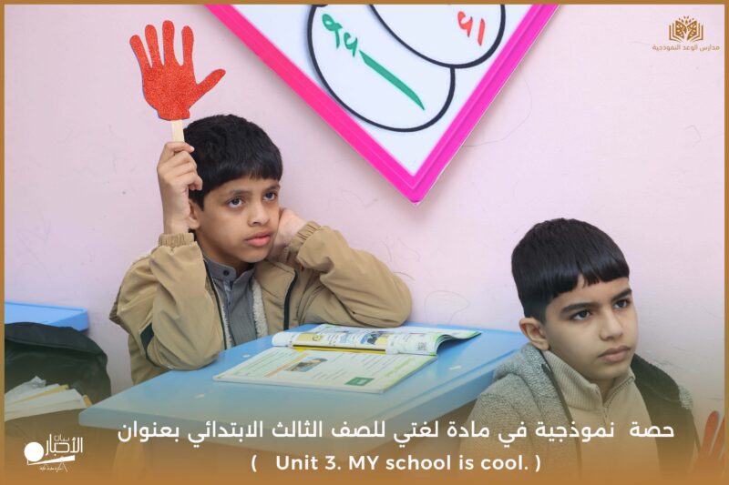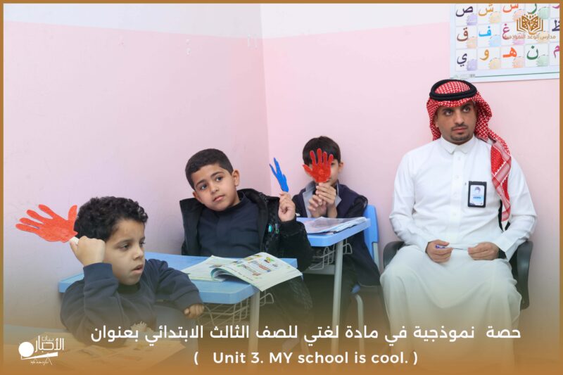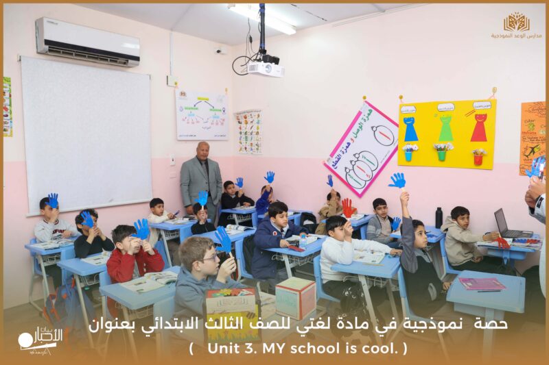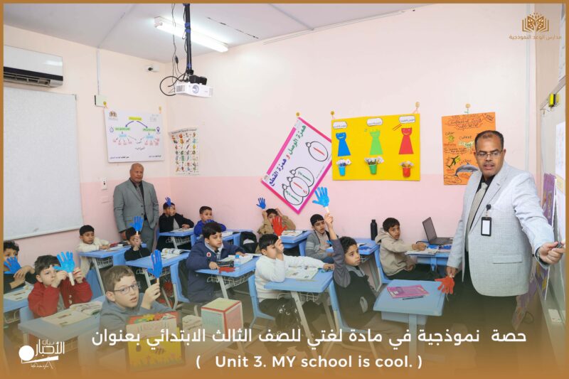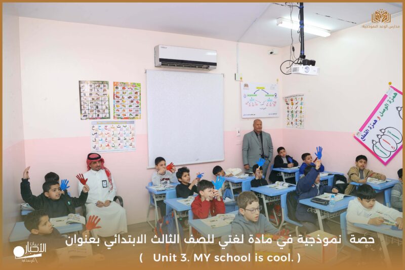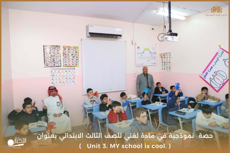 نفذت مدارس الوعد النموذجية يوم الأحد ١٧/ ١٠ /١٤٤٧ حصة نموذجية في مادة لغتي للصف الثالث الابتدائي بعنوان ( Unit 3. MY school is cool. )