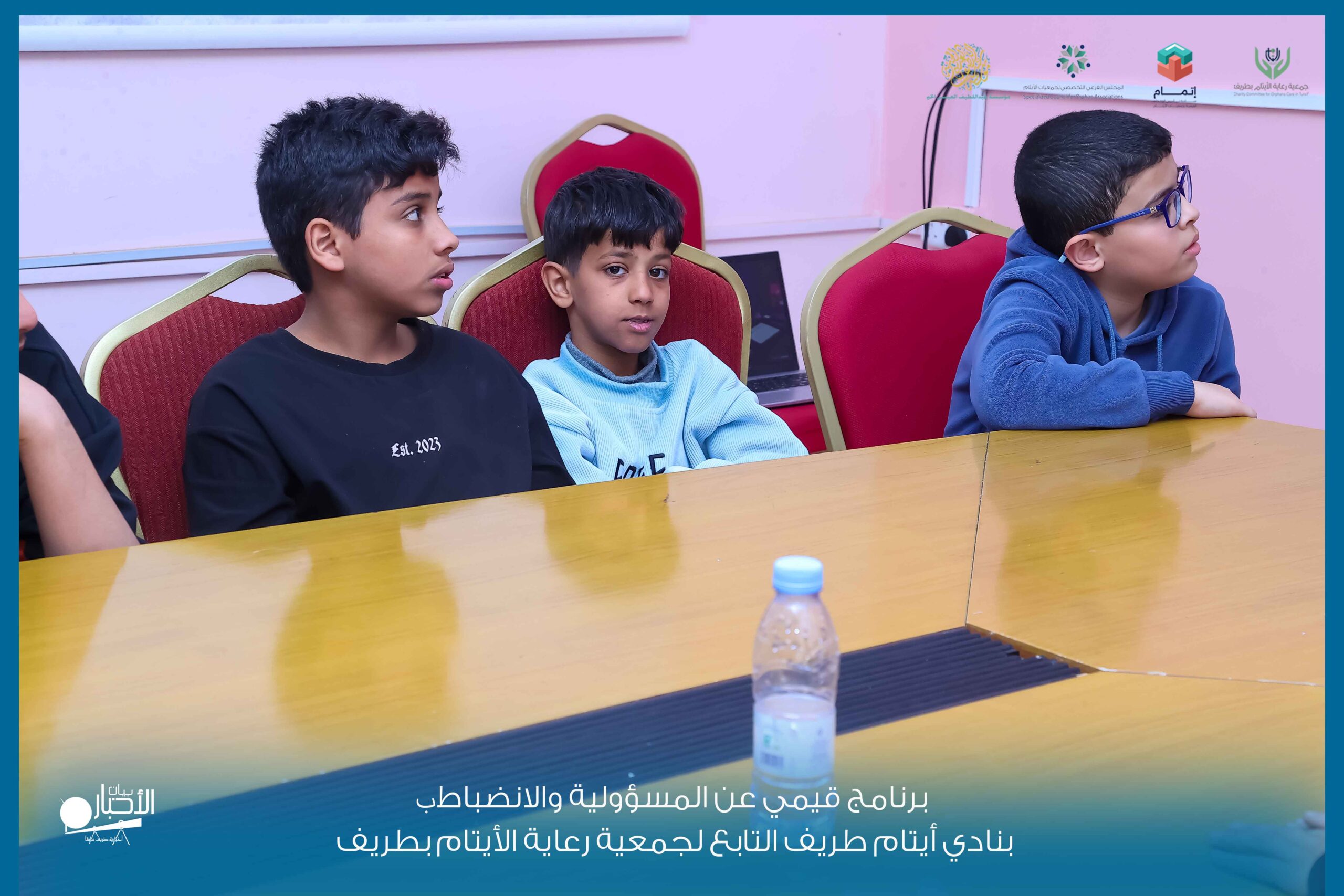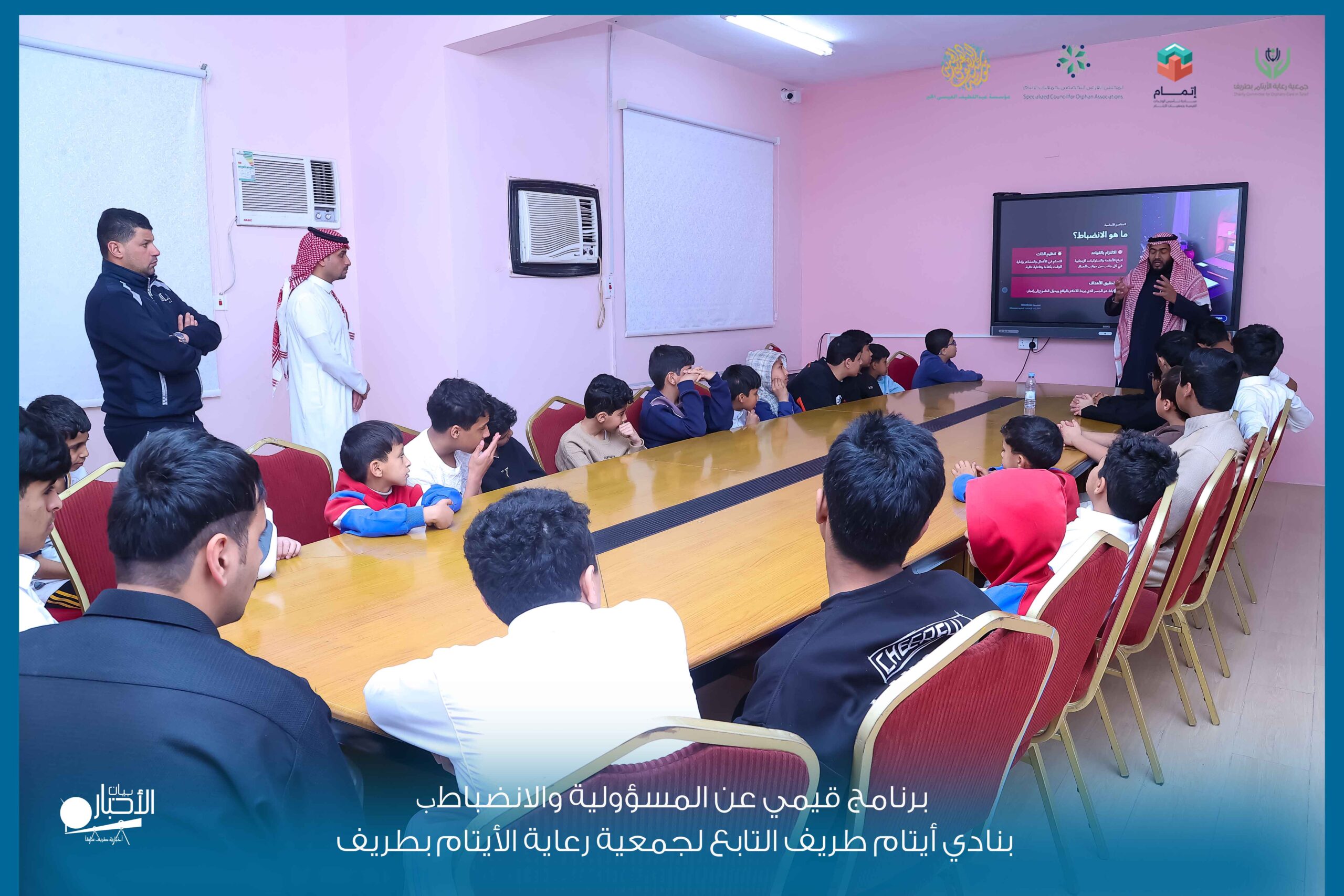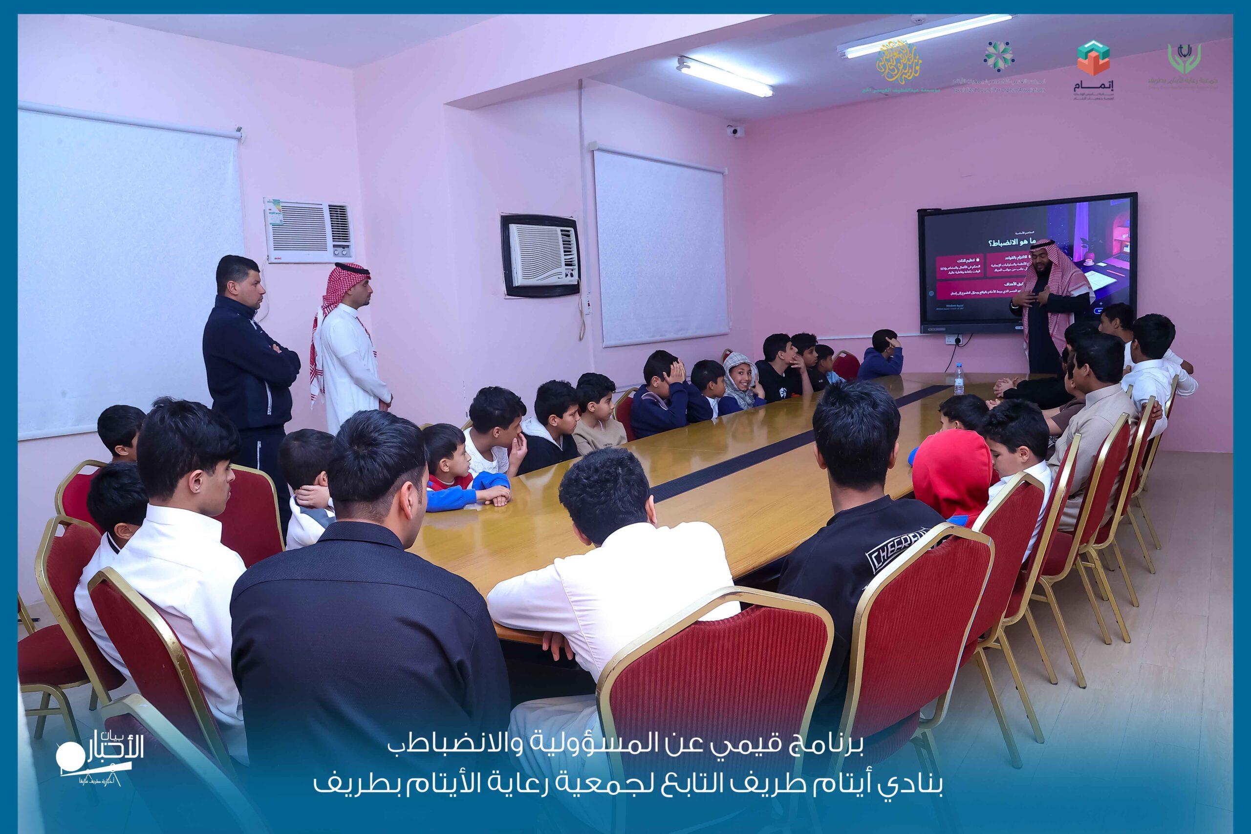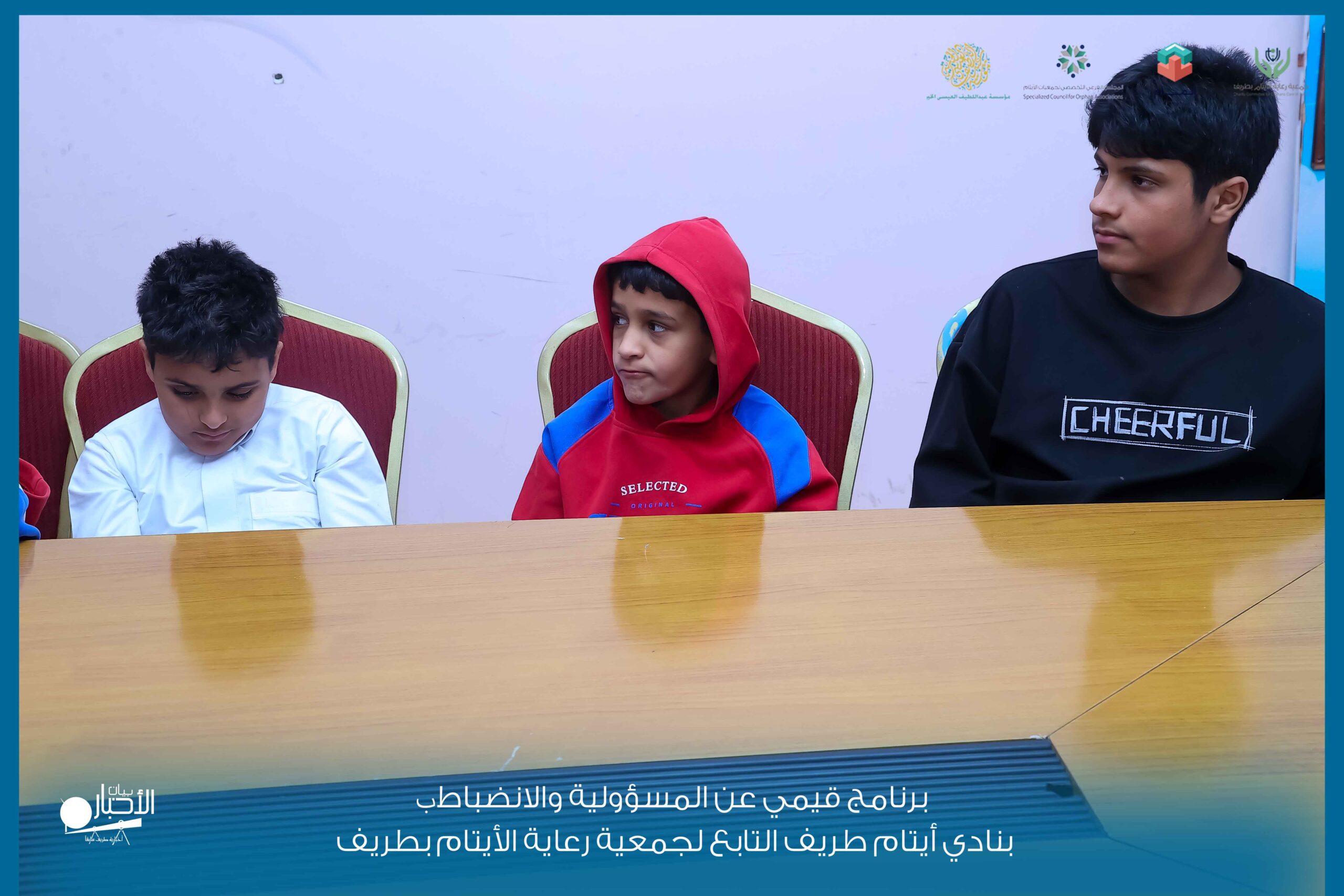 قامت وحدة القيم بنادي أيتام طريف، التابع لجمعية رعاية الأيتام بمحافظة طريف، بتنفيذ برنامج قيمي بعنوان «المسؤولية والانضباط»، وذلك بهدف تنمية هذه القيم المهمة لدى الطلاب.