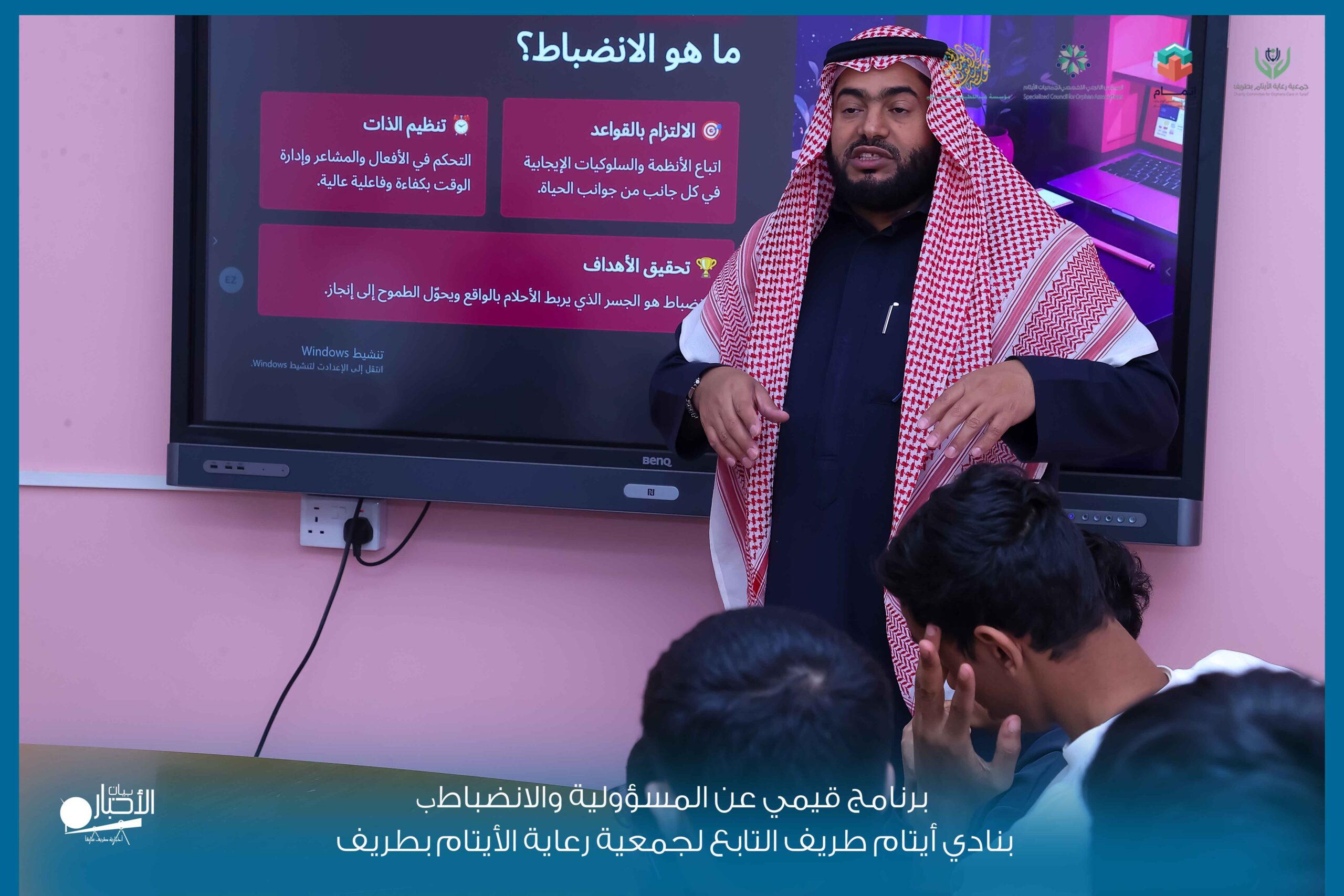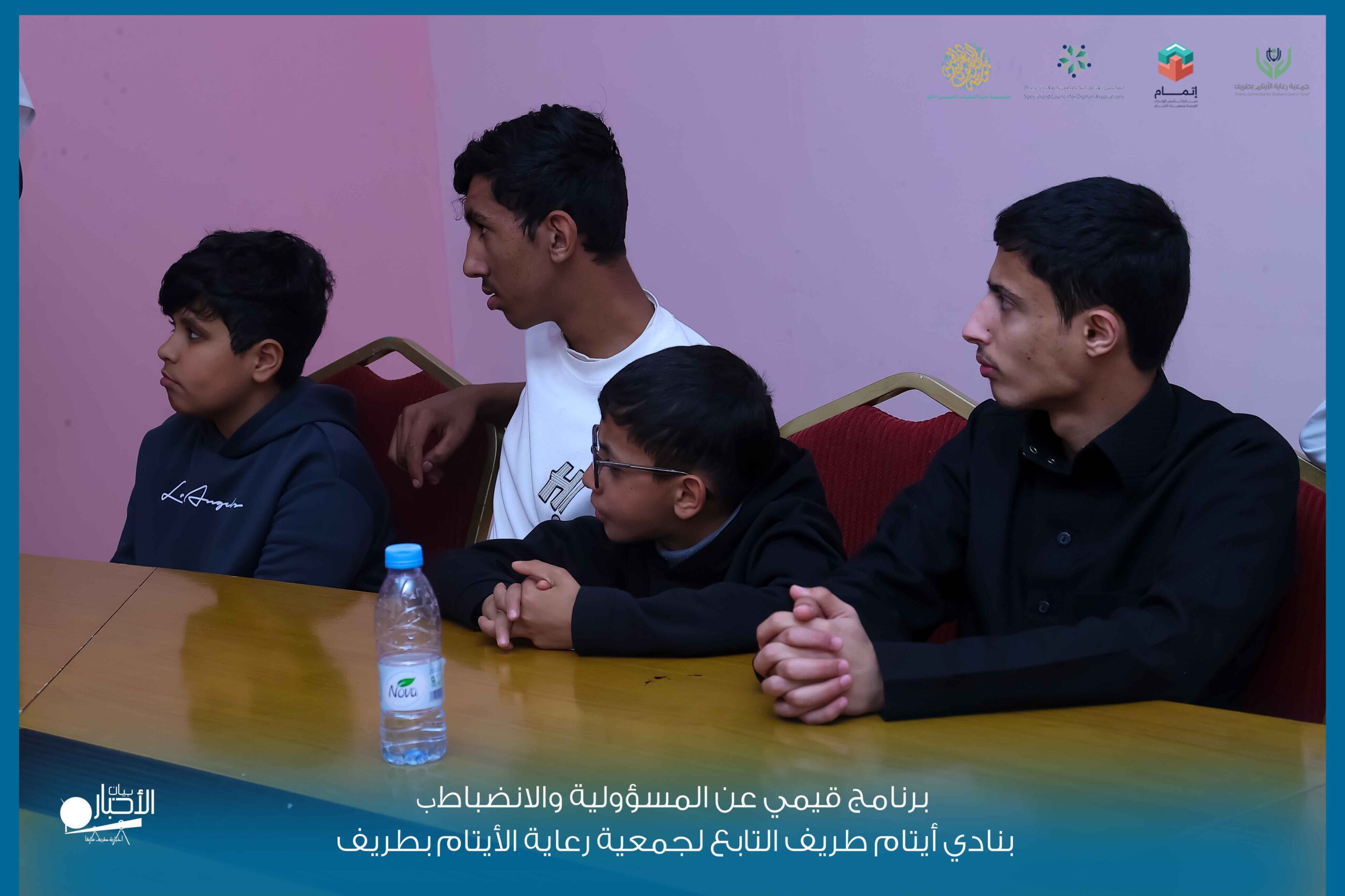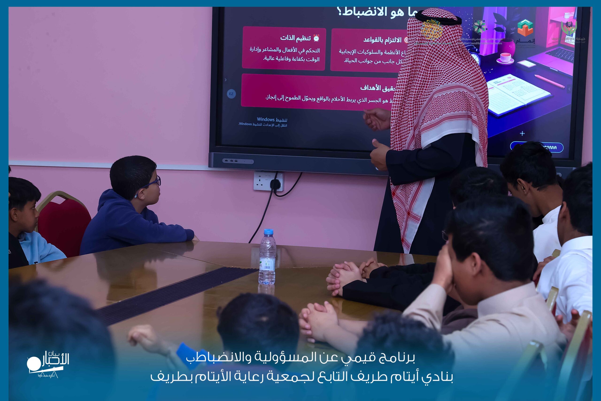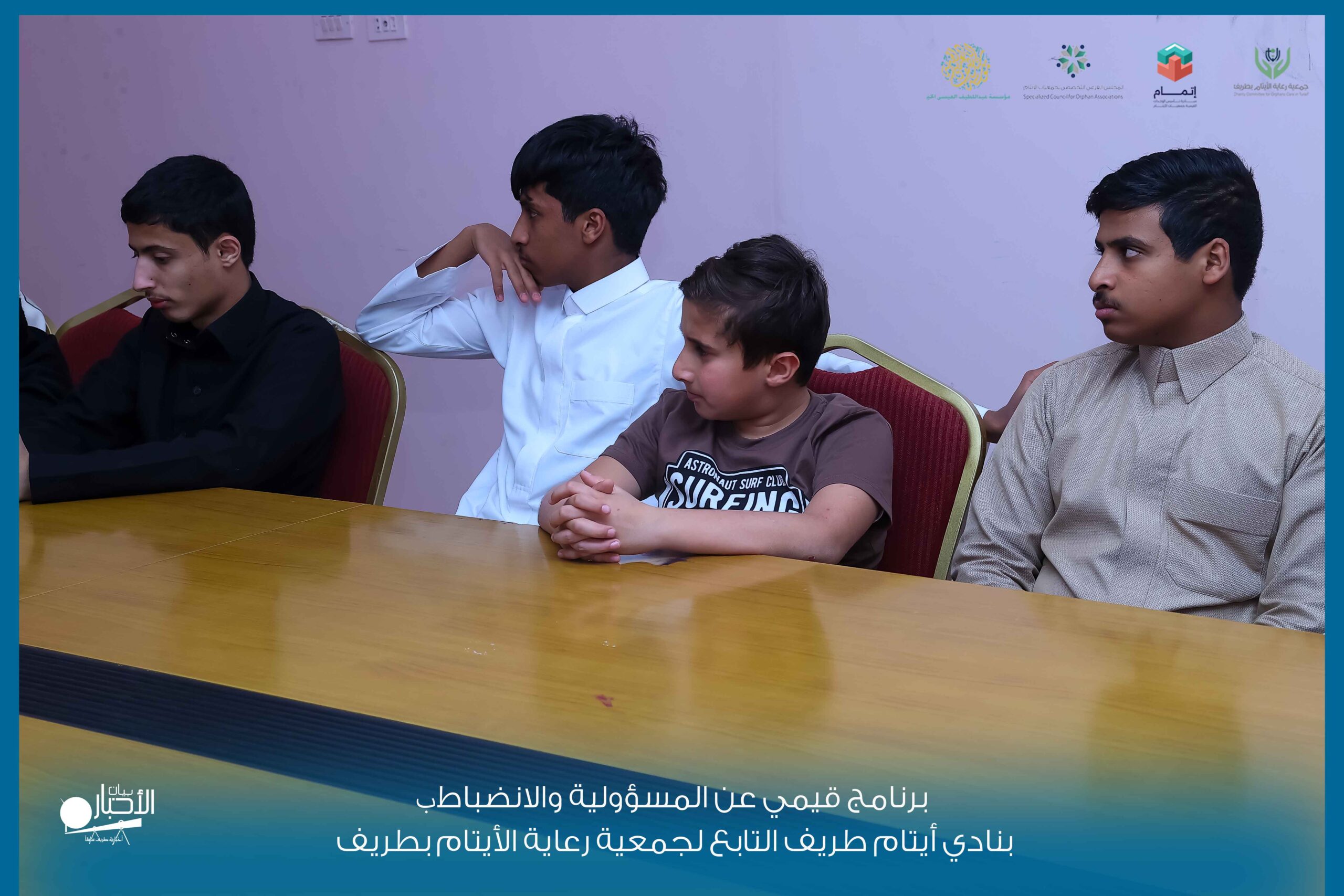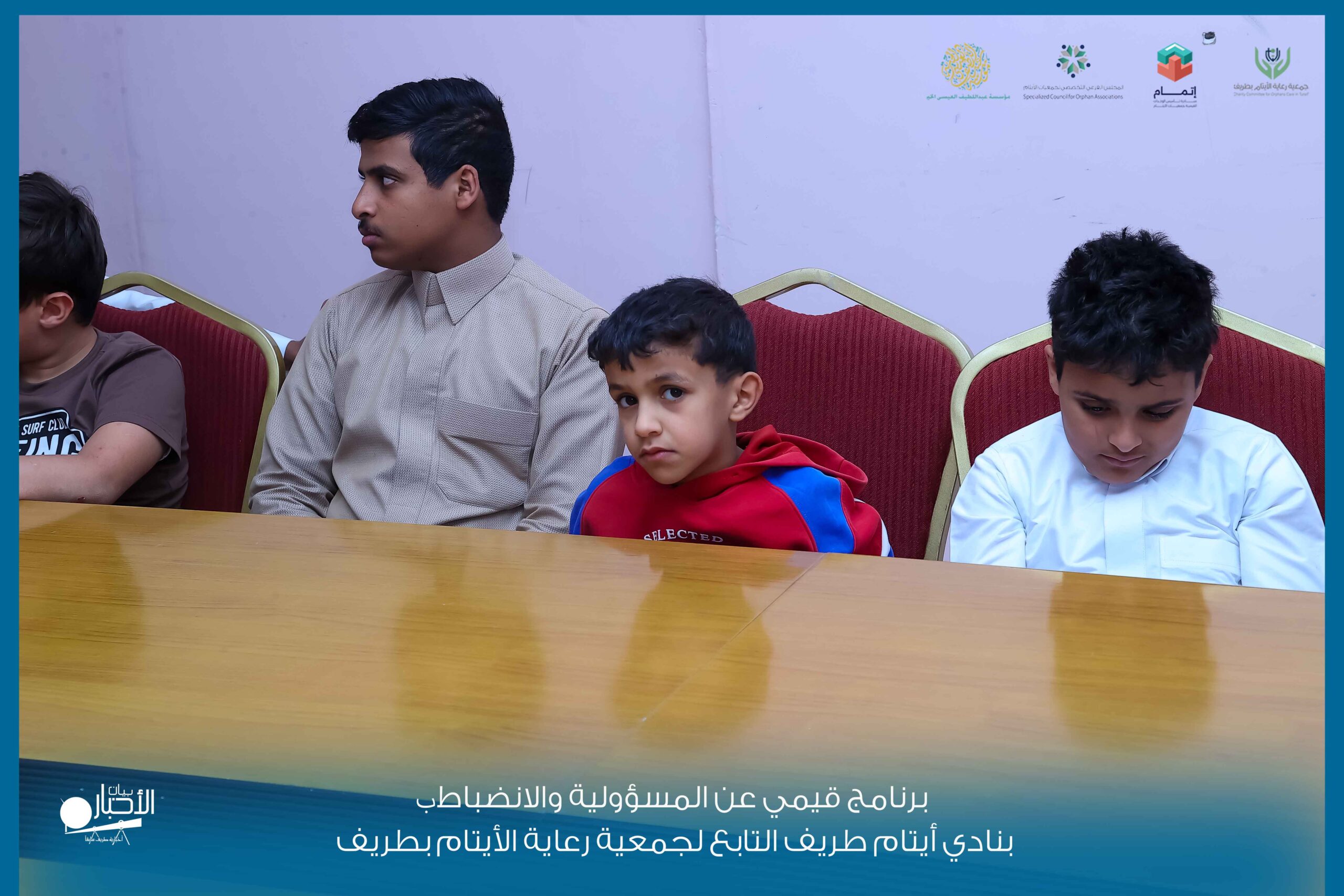 قامت وحدة القيم بنادي أيتام طريف، التابع لجمعية رعاية الأيتام بمحافظة طريف، بتنفيذ برنامج قيمي بعنوان «المسؤولية والانضباط»، وذلك بهدف تنمية هذه القيم المهمة لدى الطلاب.