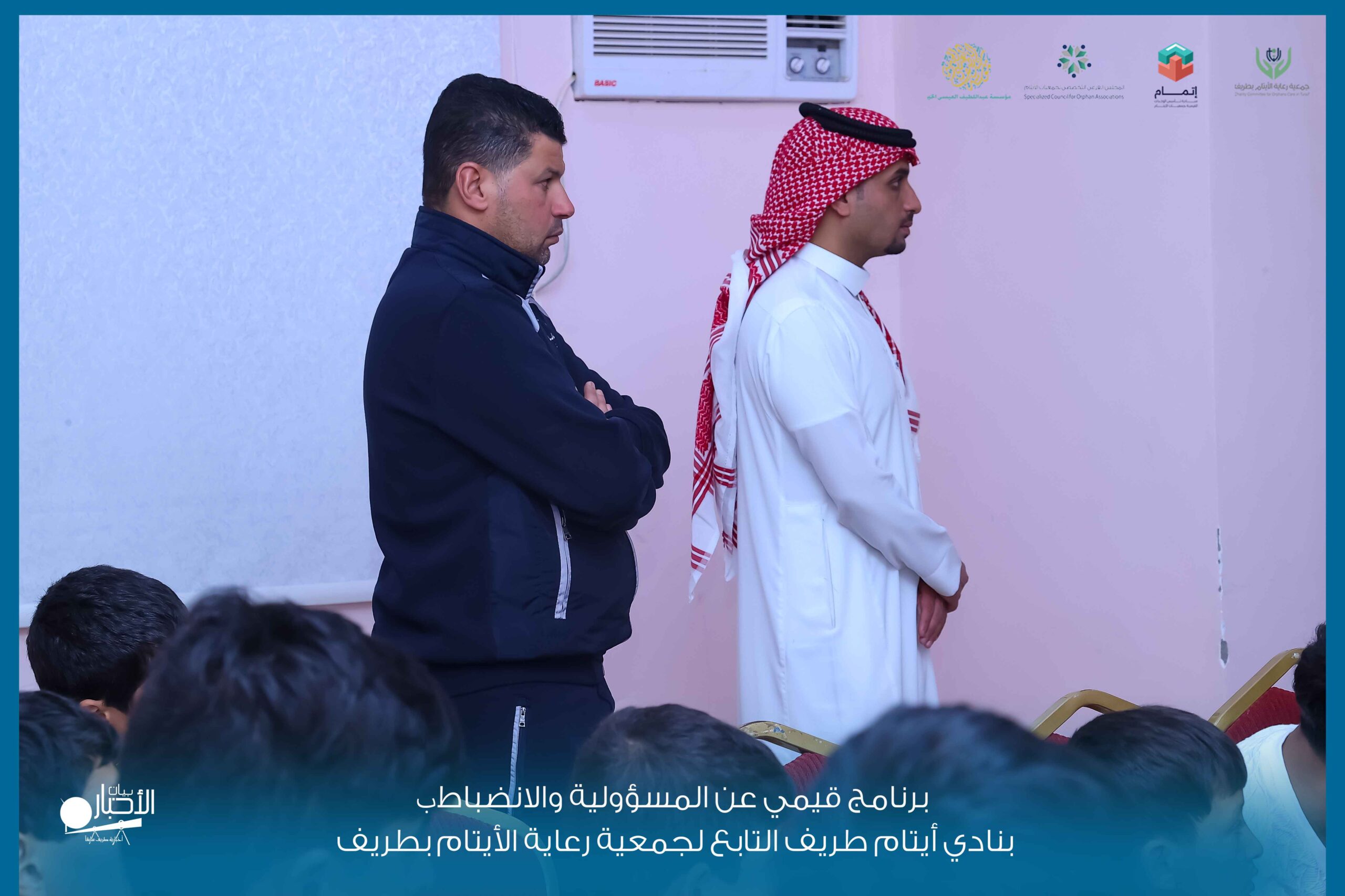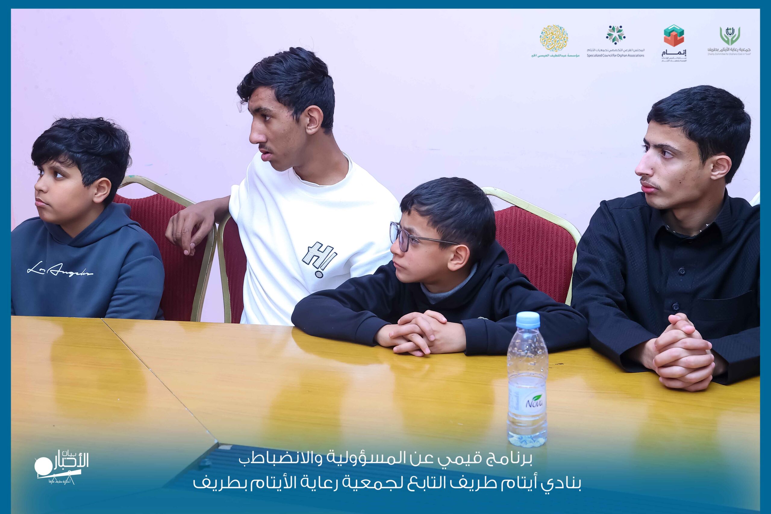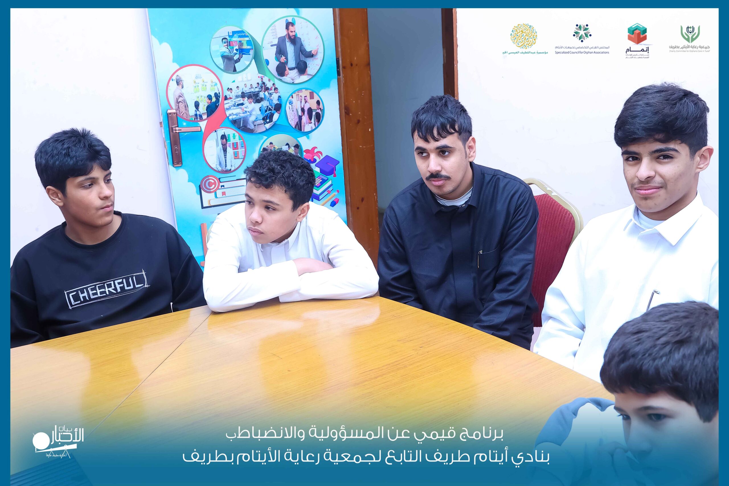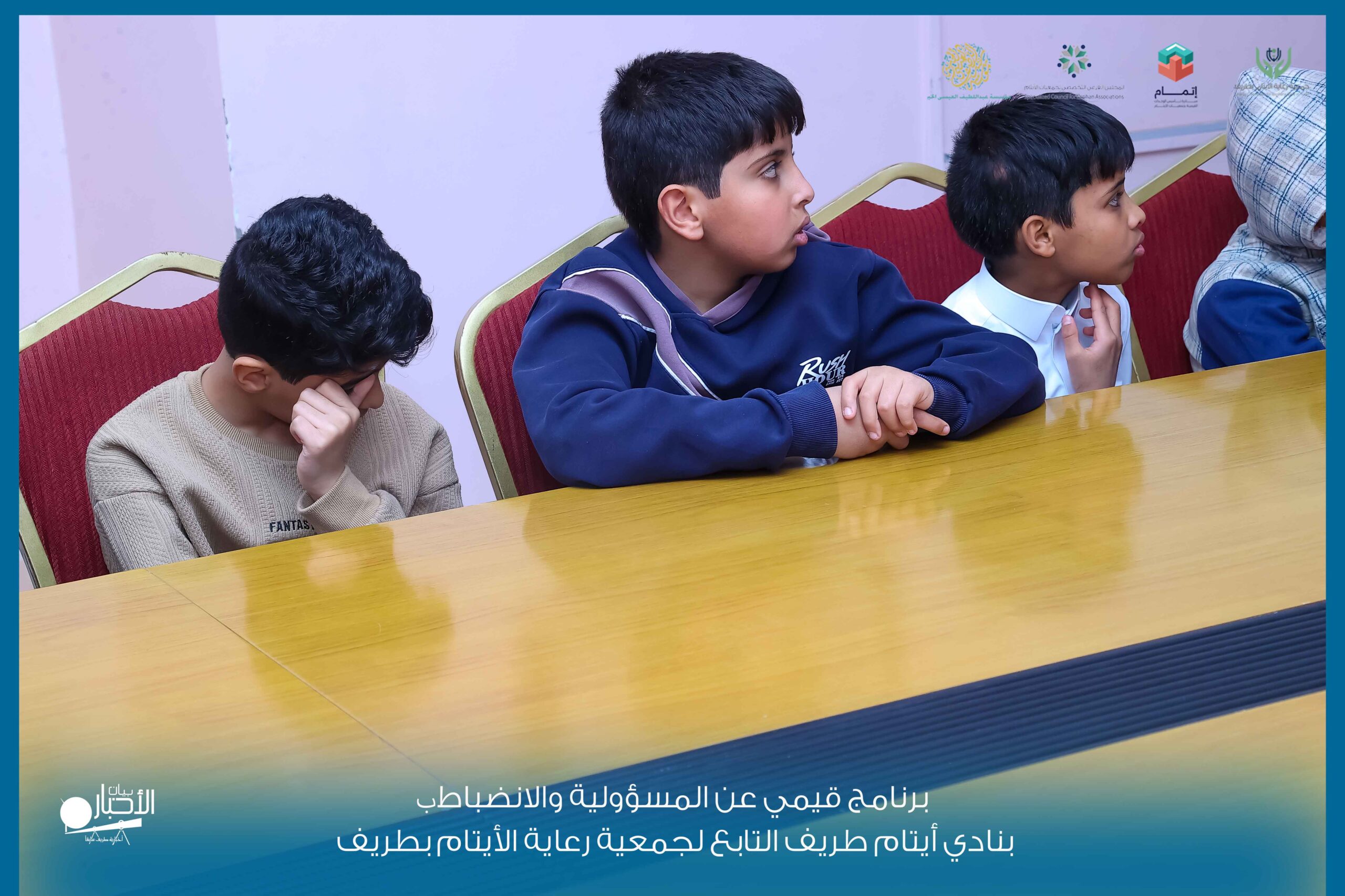 قامت وحدة القيم بنادي أيتام طريف، التابع لجمعية رعاية الأيتام بمحافظة طريف، بتنفيذ برنامج قيمي بعنوان «المسؤولية والانضباط»، وذلك بهدف تنمية هذه القيم المهمة لدى الطلاب.
