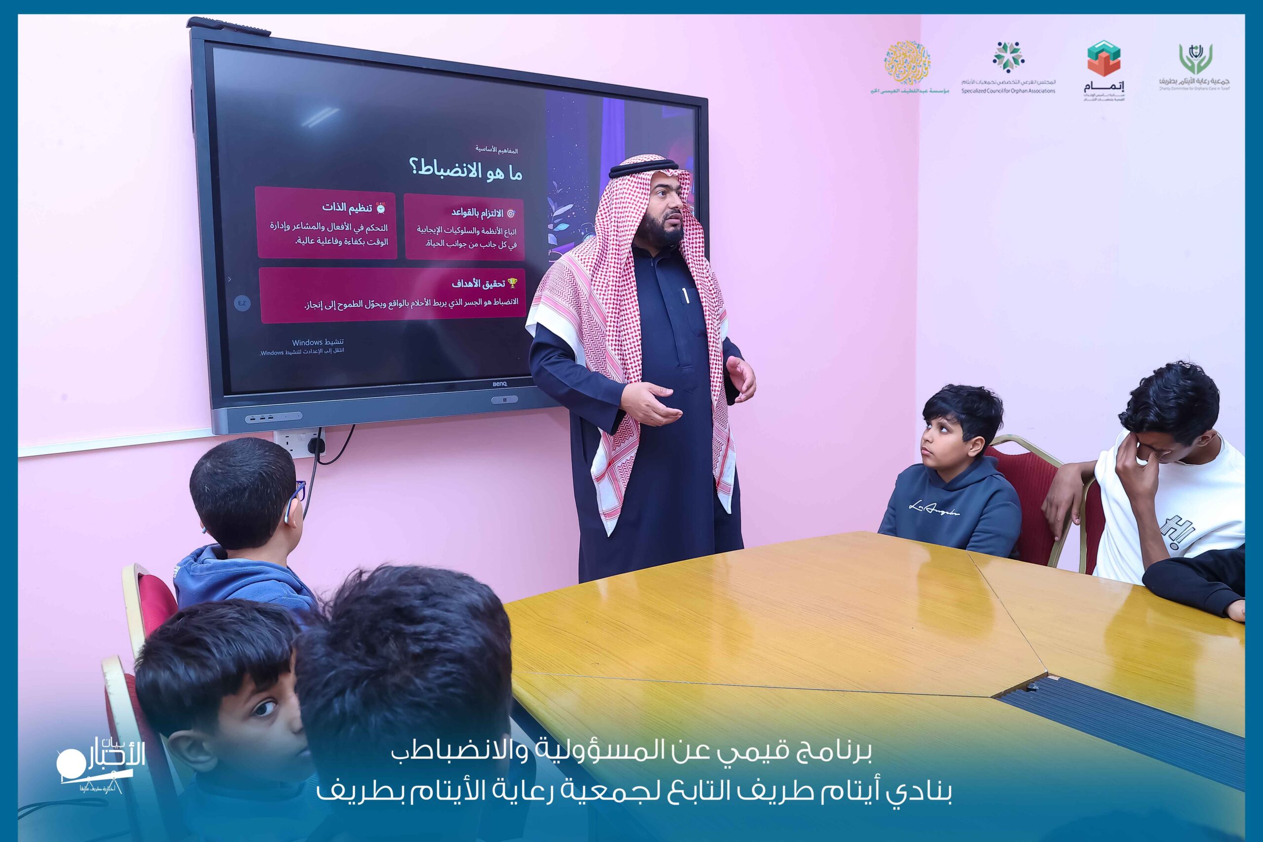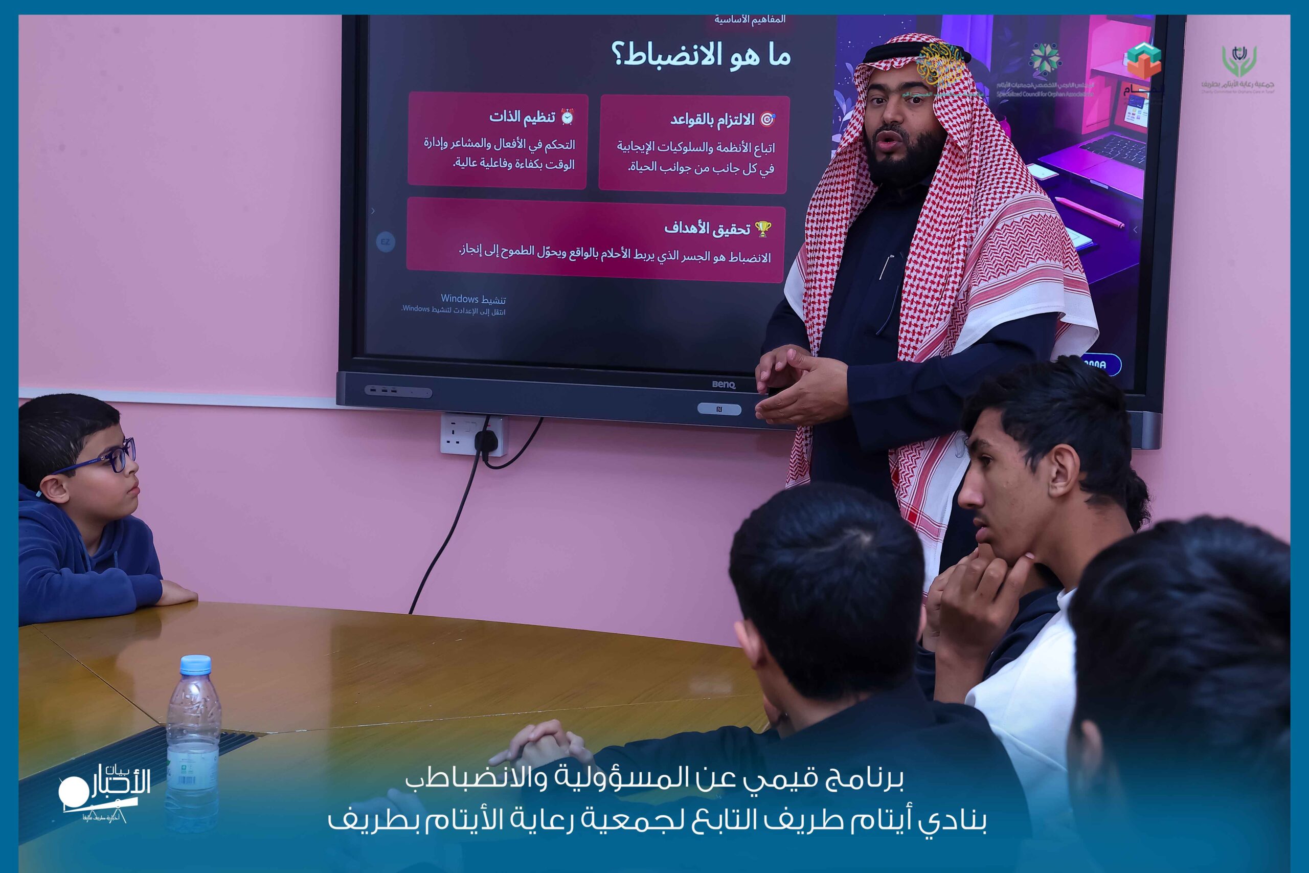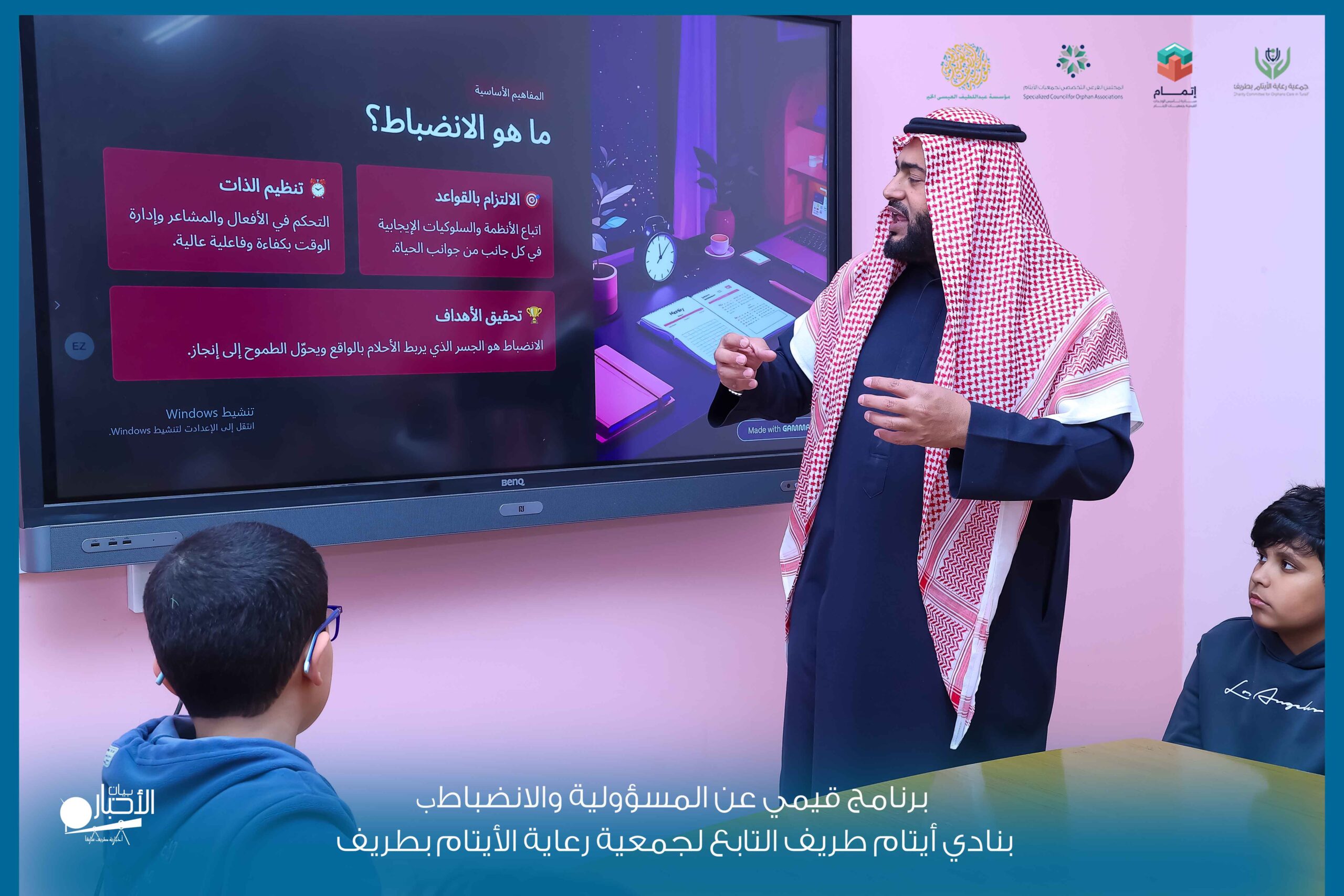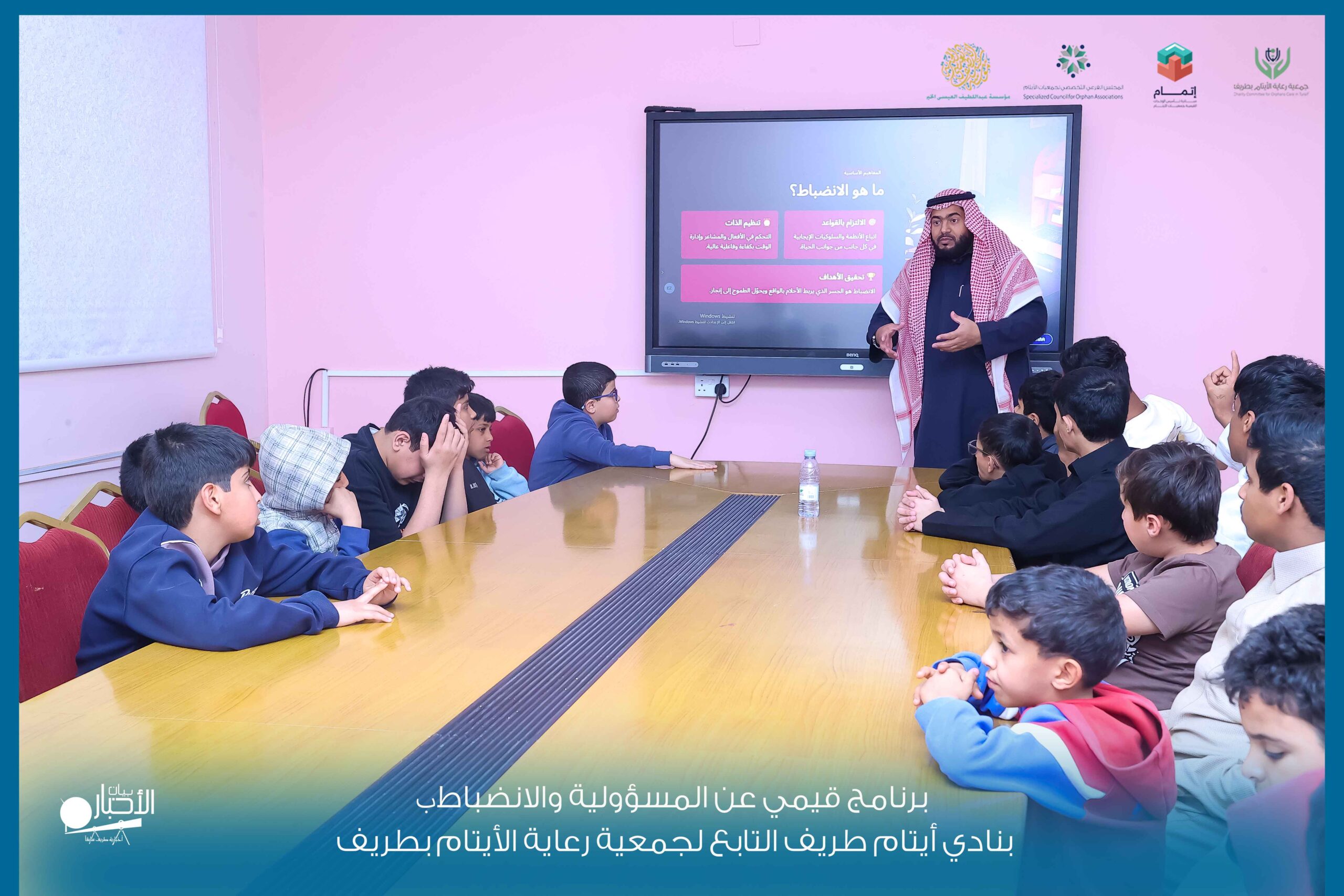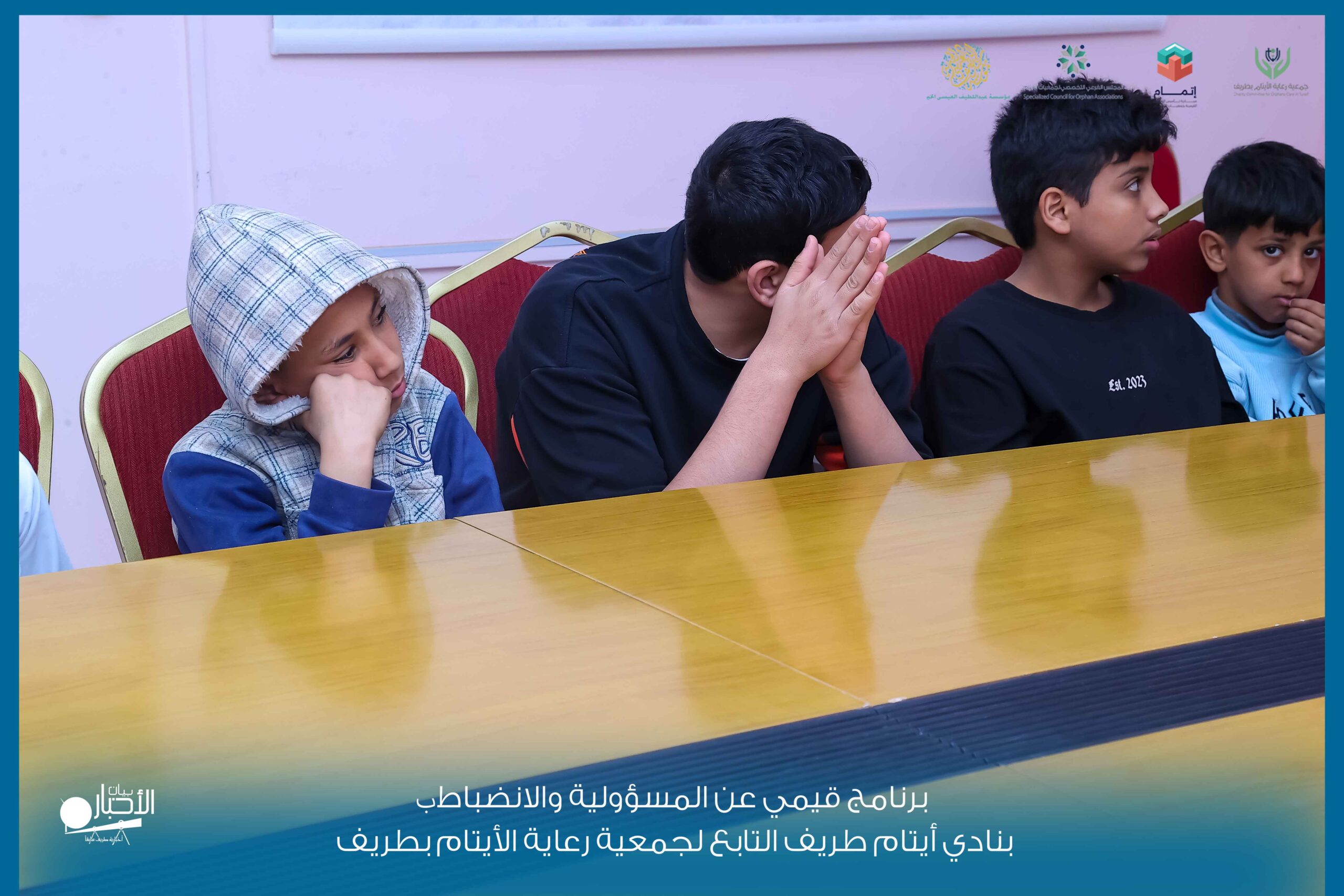قامت وحدة القيم بنادي أيتام طريف، التابع لجمعية رعاية الأيتام بمحافظة طريف، بتنفيذ برنامج قيمي بعنوان «المسؤولية والانضباط»، وذلك بهدف تنمية هذه القيم المهمة لدى الطلاب.