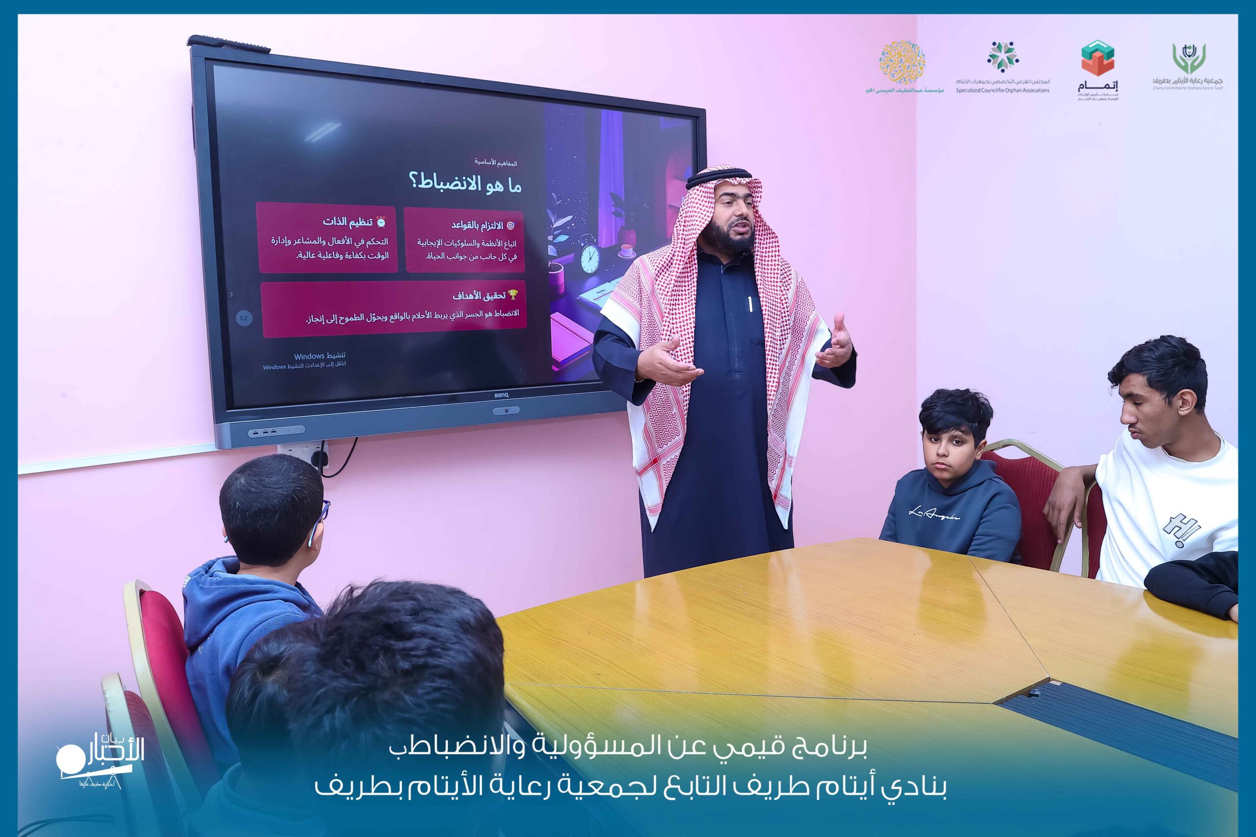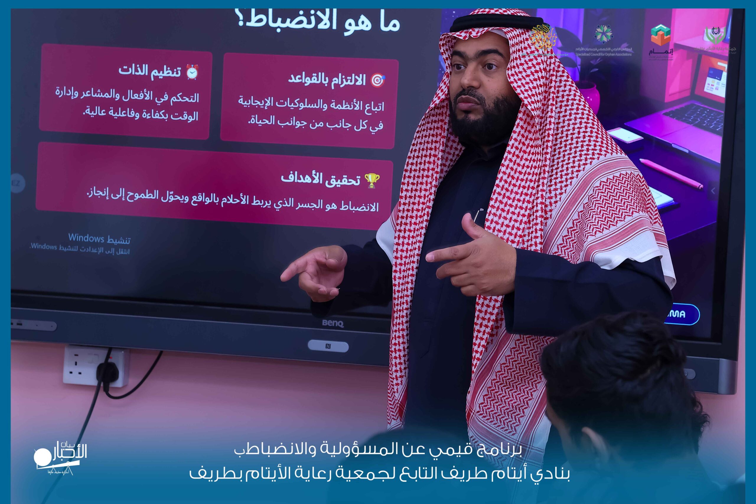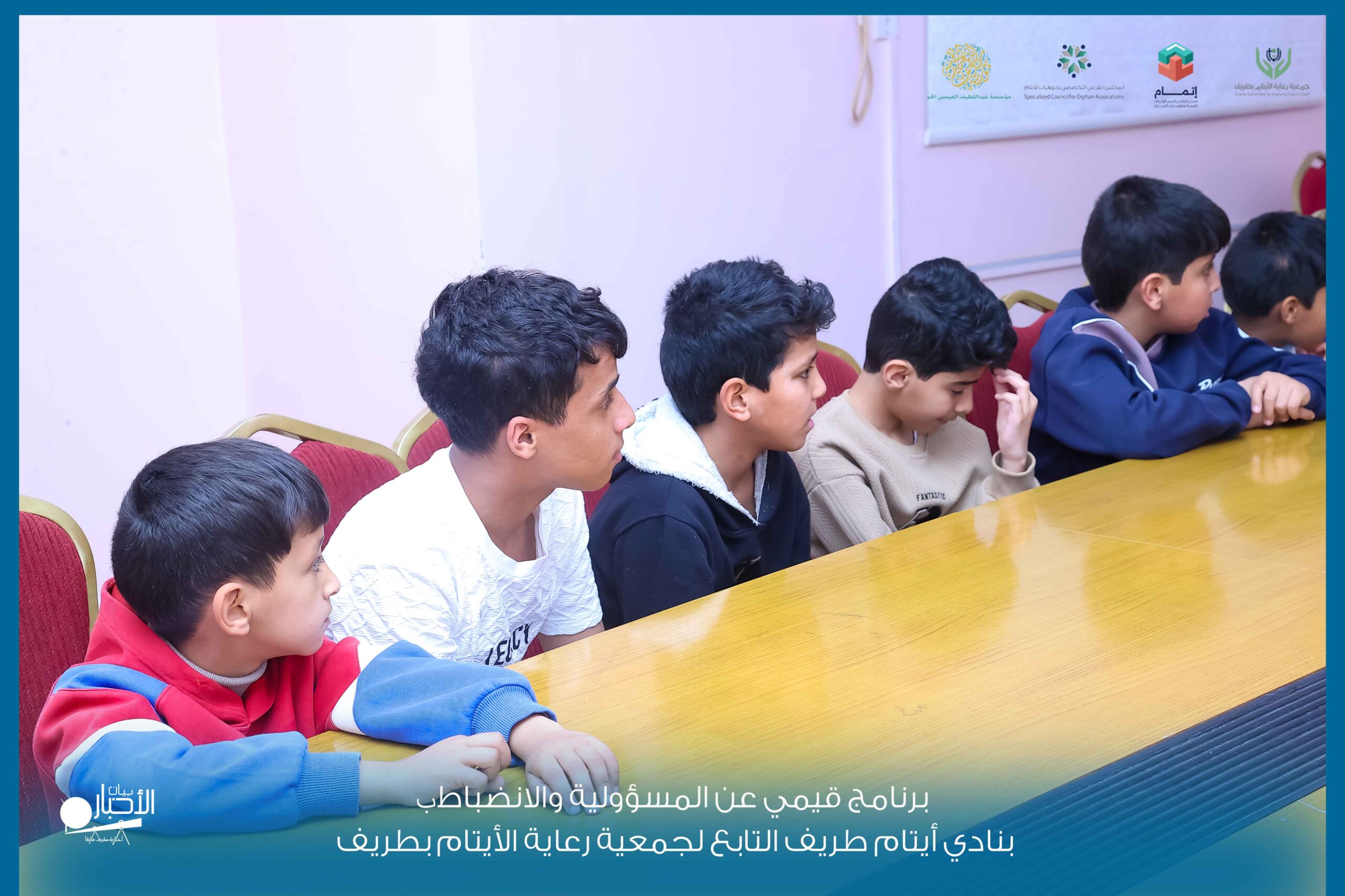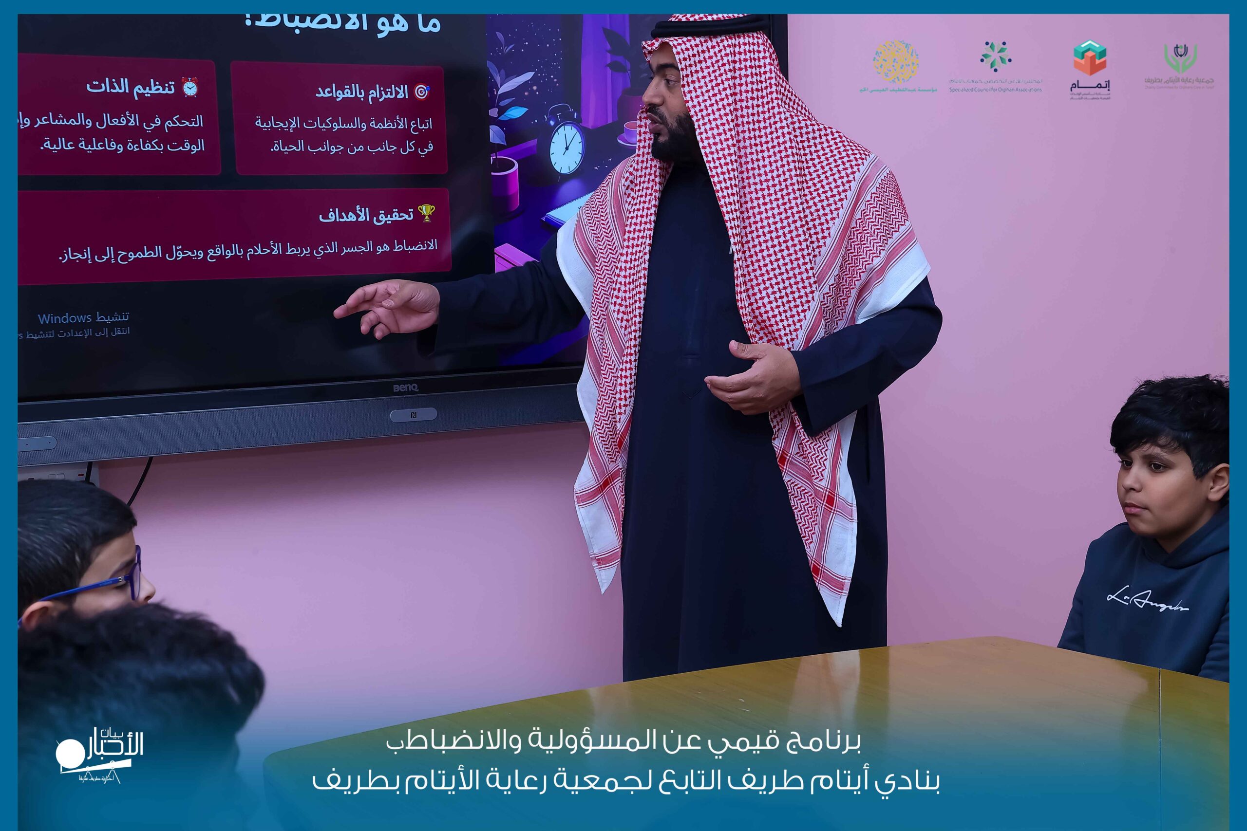 قامت وحدة القيم بنادي أيتام طريف، التابع لجمعية رعاية الأيتام بمحافظة طريف، بتنفيذ برنامج قيمي بعنوان «المسؤولية والانضباط»، وذلك بهدف تنمية هذه القيم المهمة لدى الطلاب.