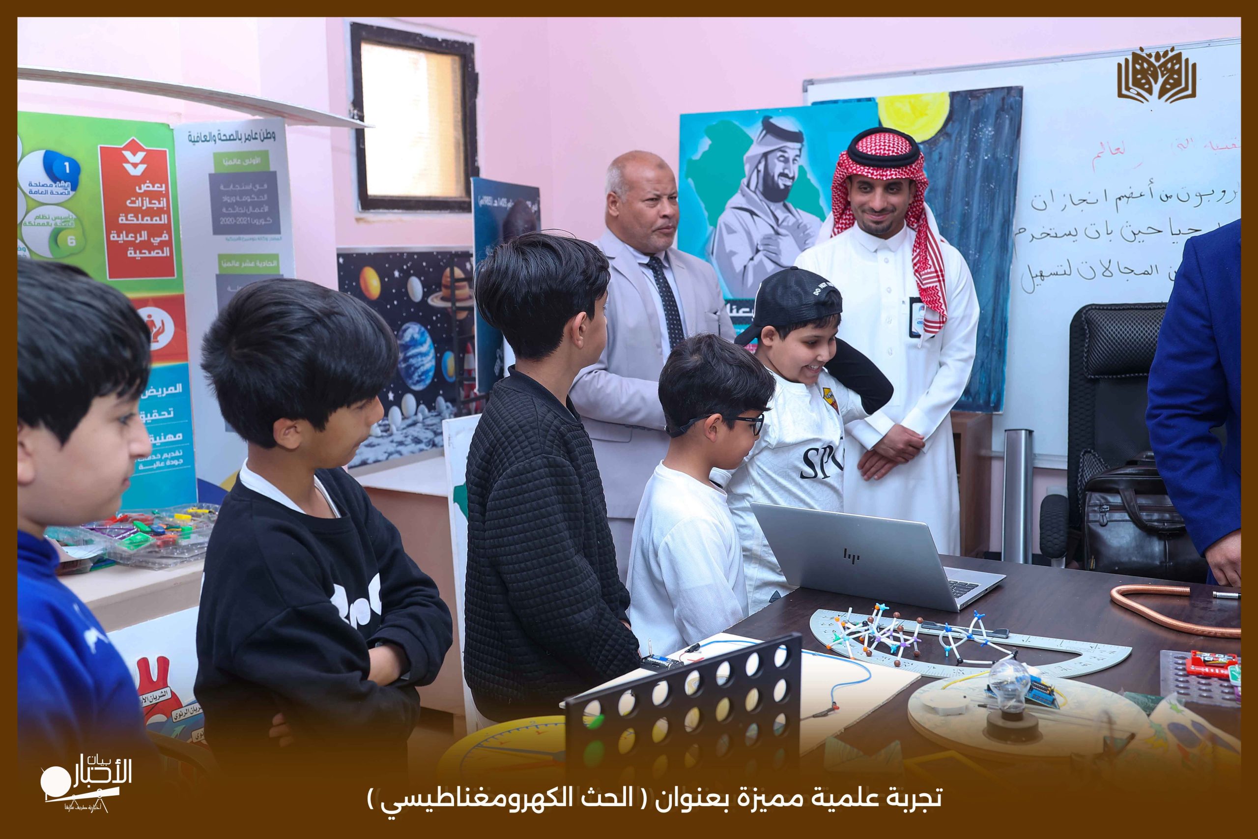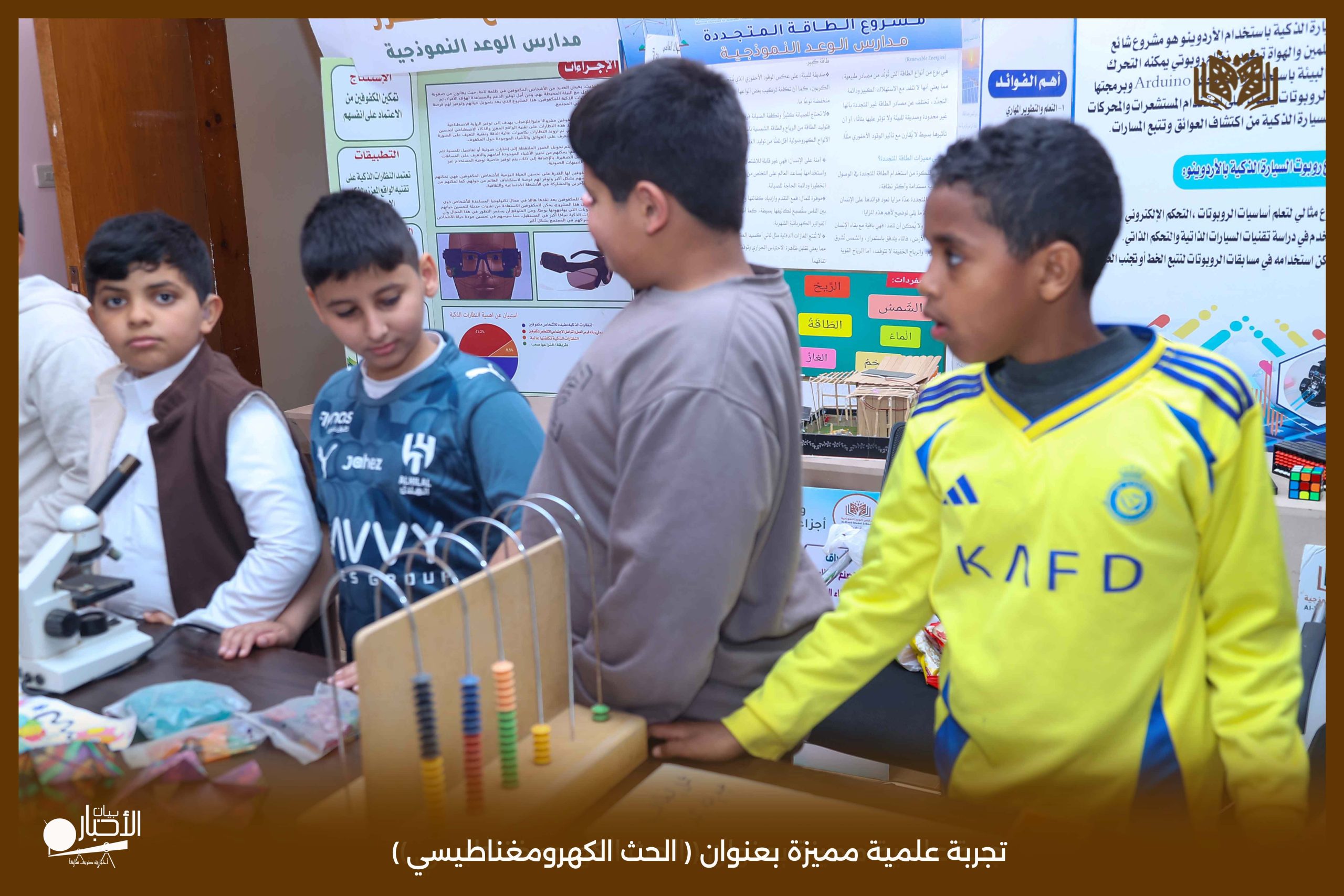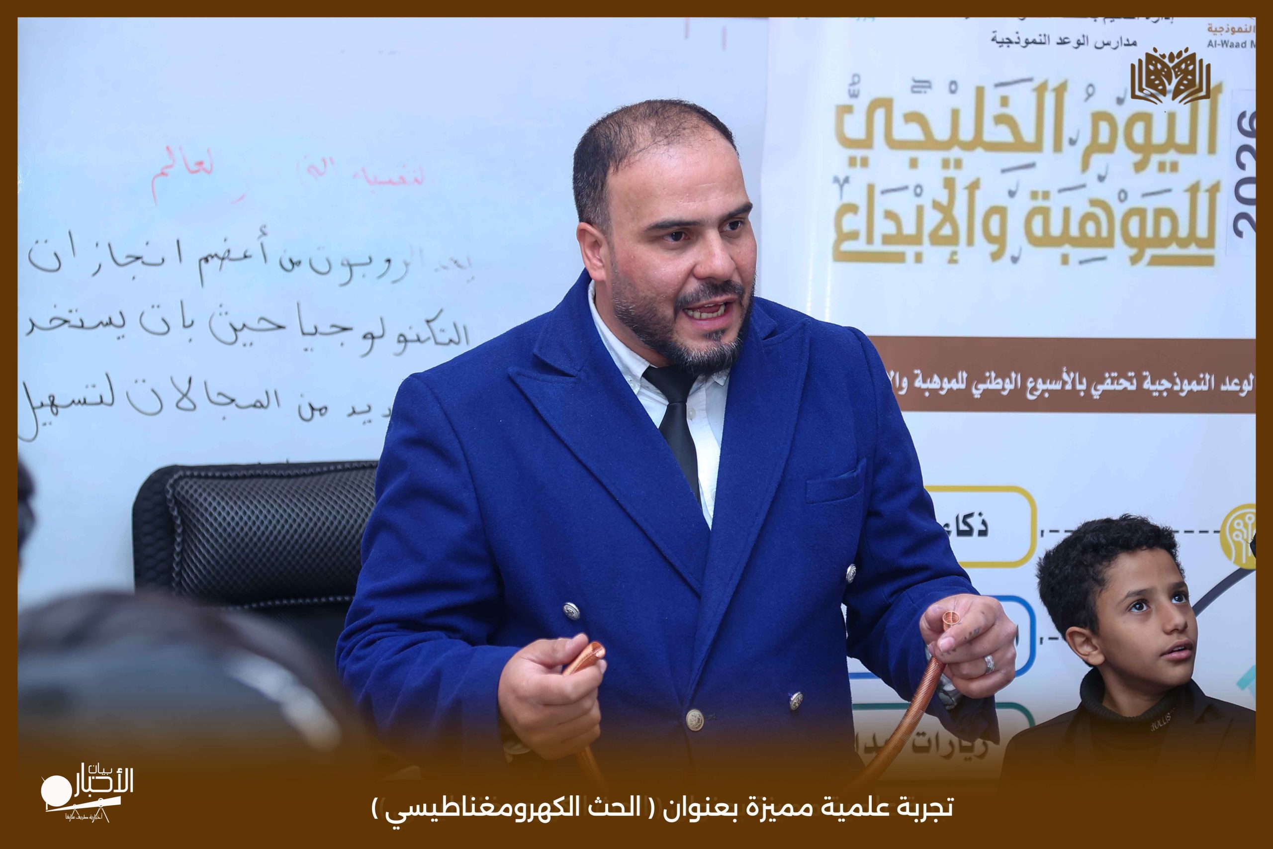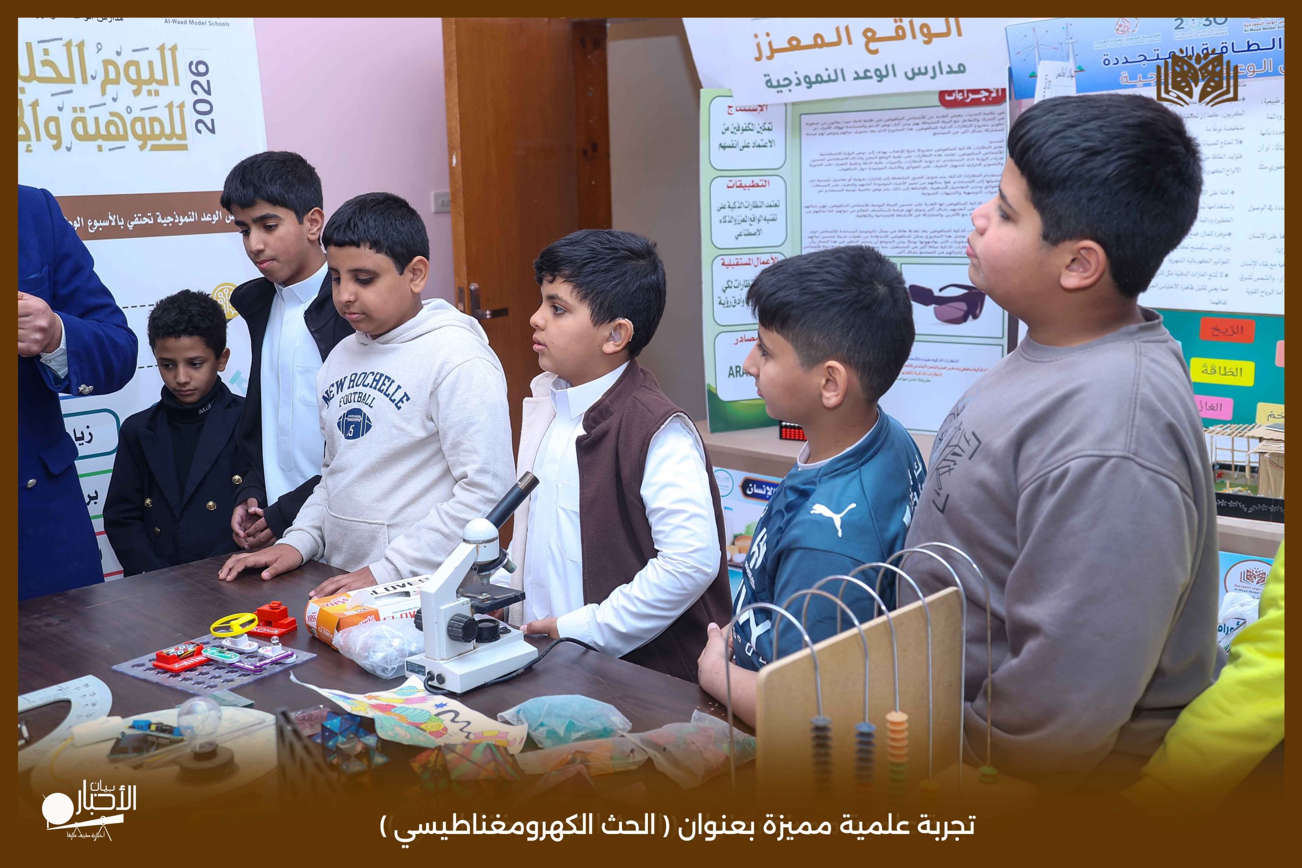 نفذت ابتدائية الوعد النموذجية تجربة علمية مميزة بعنوان ( الحث الكهرومغناطيسي ) وذلك ضمن خطة النشاط العلمي وبرامج الموهوبين، حيث بدأ المعلم التجربة بتعريف الطلاب مفهوم الحث الكهرومغناطيسي وهو توليد تيار كهربائي نتيجة تغير المجال المغناطيسي وهو المبدأ الذي اكتشفه العالم مايكل فاراداي، وخلال التنفيذ قام الطلاب بتحريك المغناطيس داخل الملف وخارجه ملاحظين انحراف مؤشر جهاز القياس مما يدل على توليد تيار كهربائي.