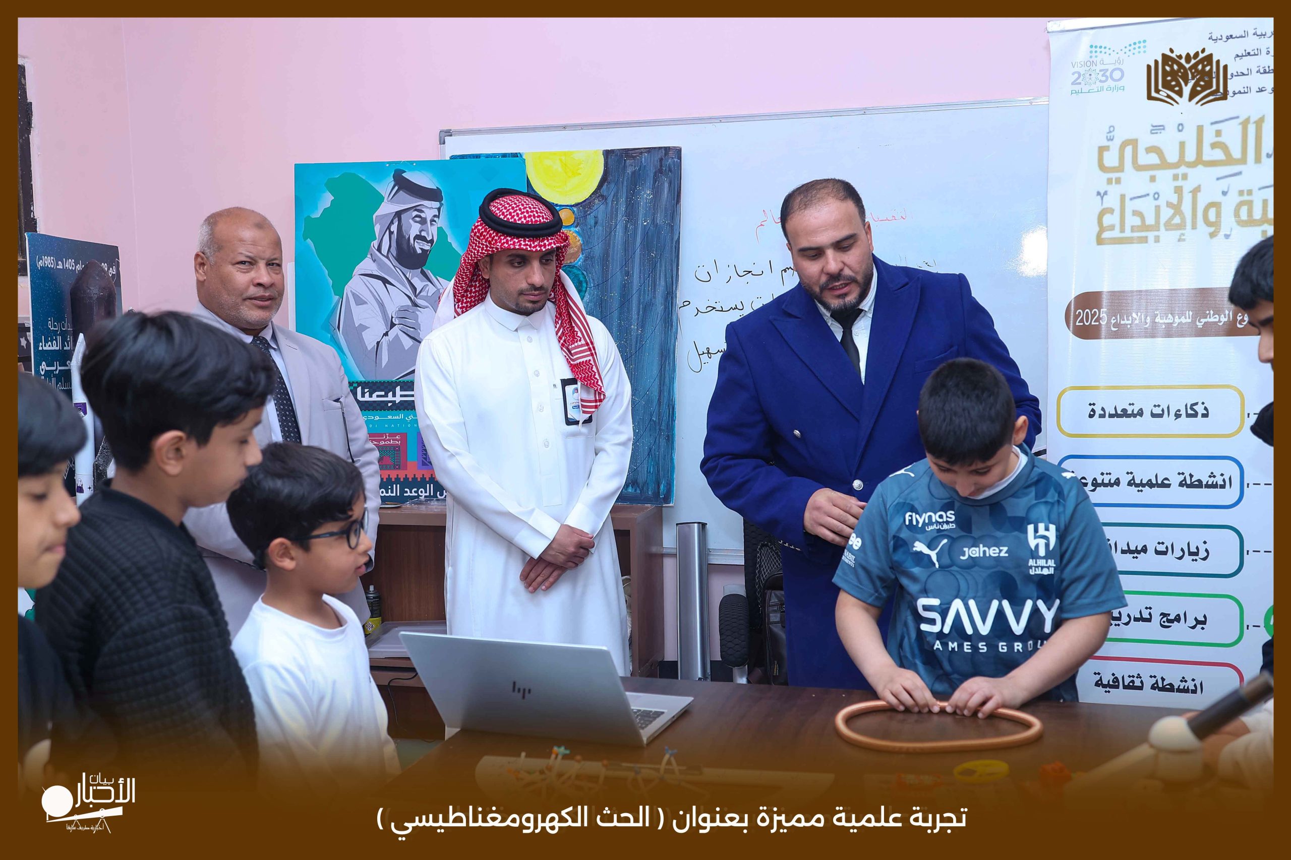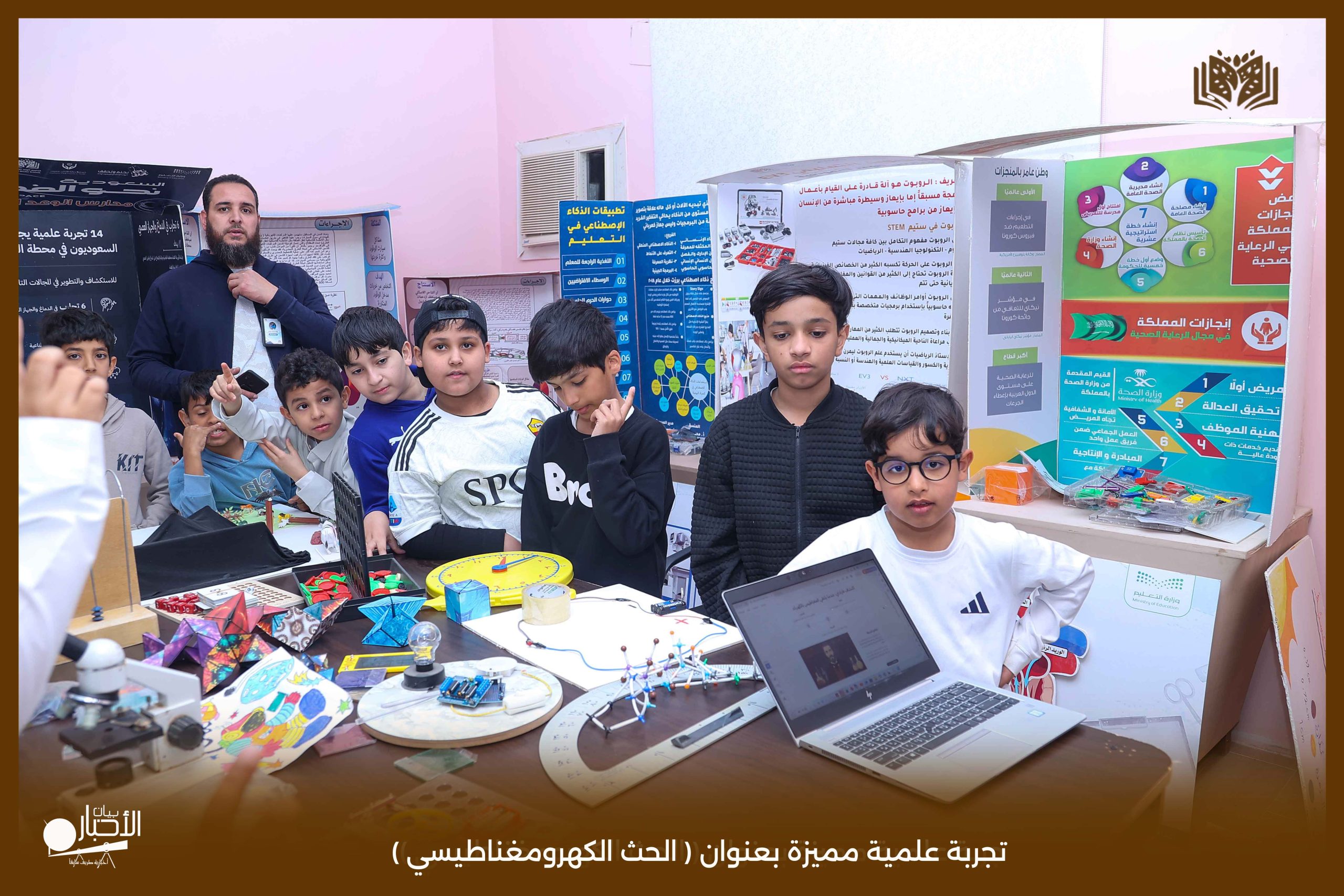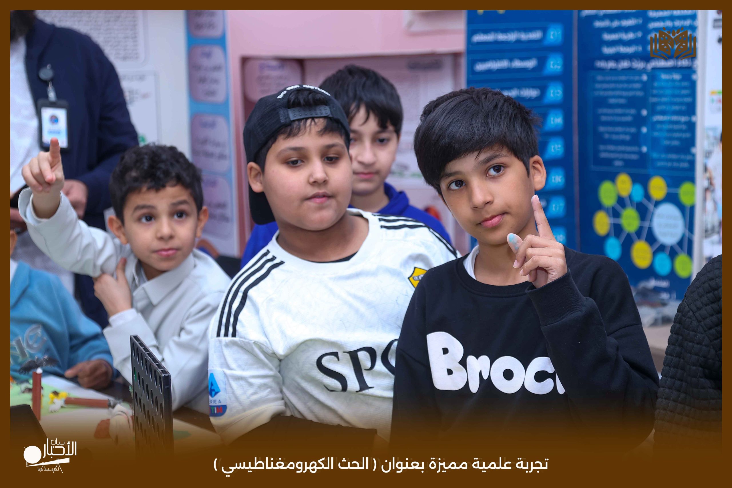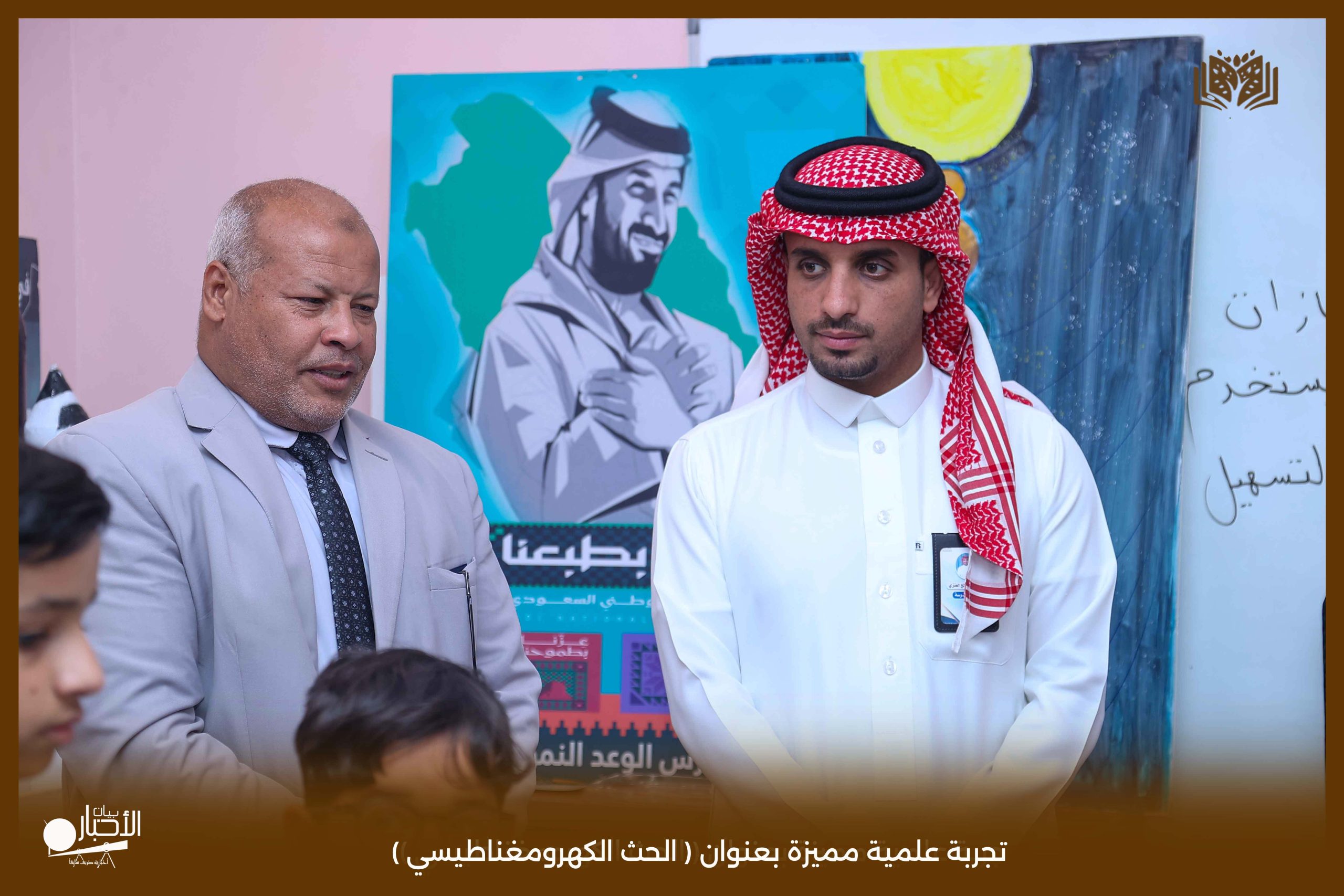 نفذت ابتدائية الوعد النموذجية تجربة علمية مميزة بعنوان ( الحث الكهرومغناطيسي ) وذلك ضمن خطة النشاط العلمي وبرامج الموهوبين، حيث بدأ المعلم التجربة بتعريف الطلاب مفهوم الحث الكهرومغناطيسي وهو توليد تيار كهربائي نتيجة تغير المجال المغناطيسي وهو المبدأ الذي اكتشفه العالم مايكل فاراداي، وخلال التنفيذ قام الطلاب بتحريك المغناطيس داخل الملف وخارجه ملاحظين انحراف مؤشر جهاز القياس مما يدل على توليد تيار كهربائي.