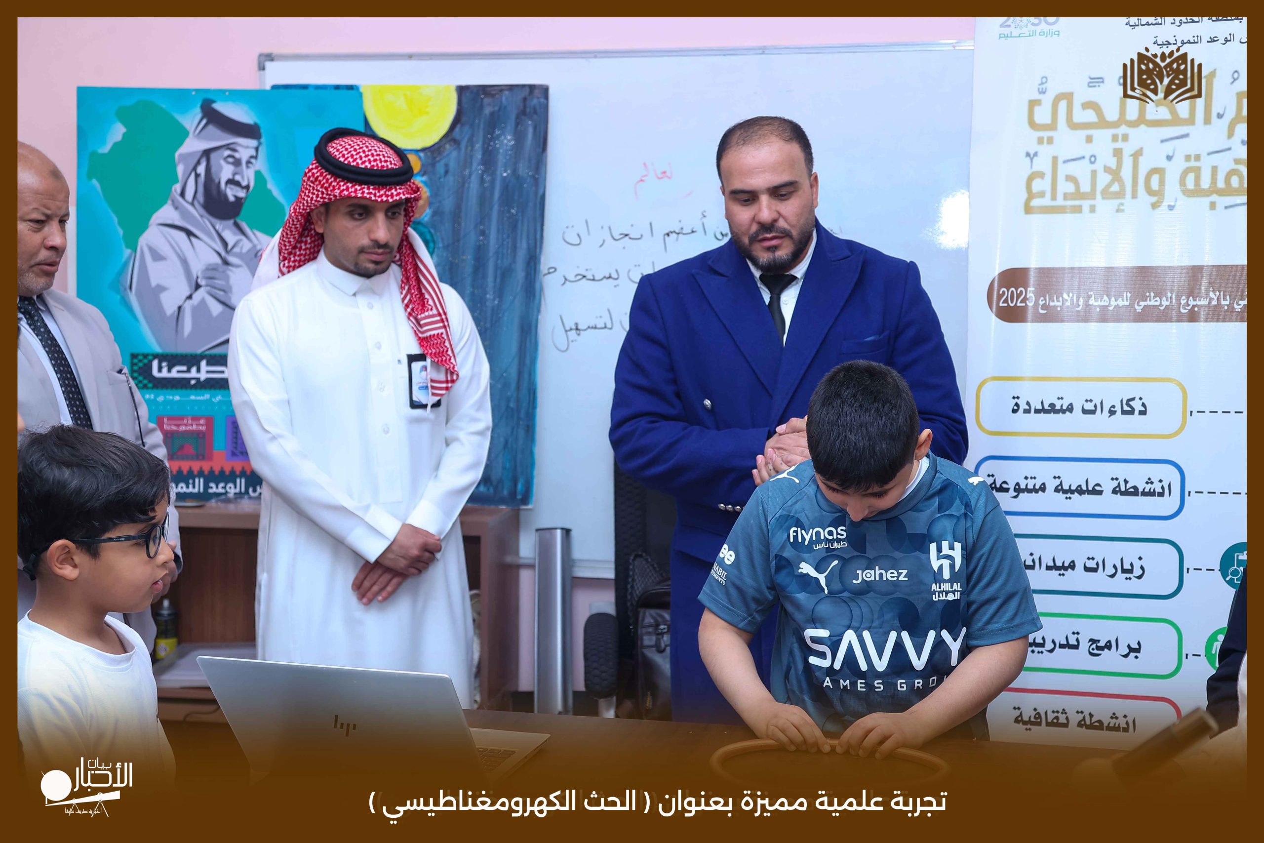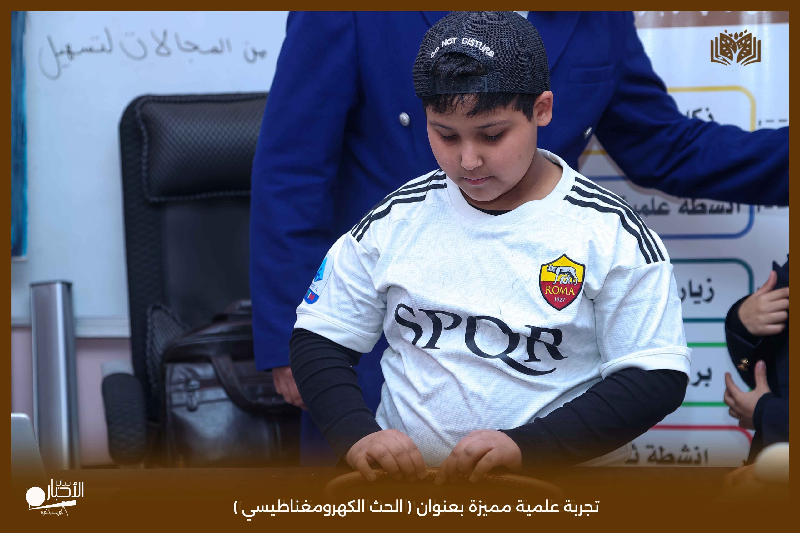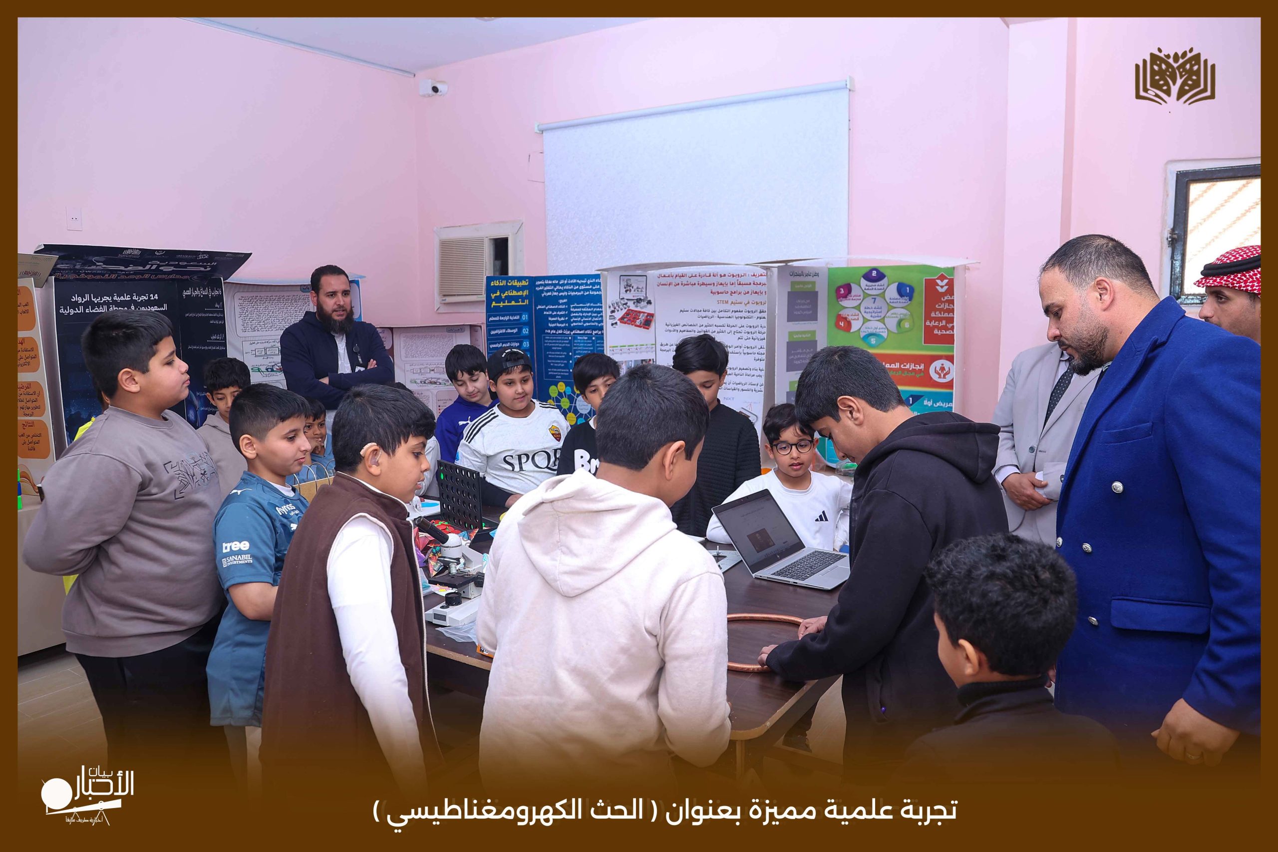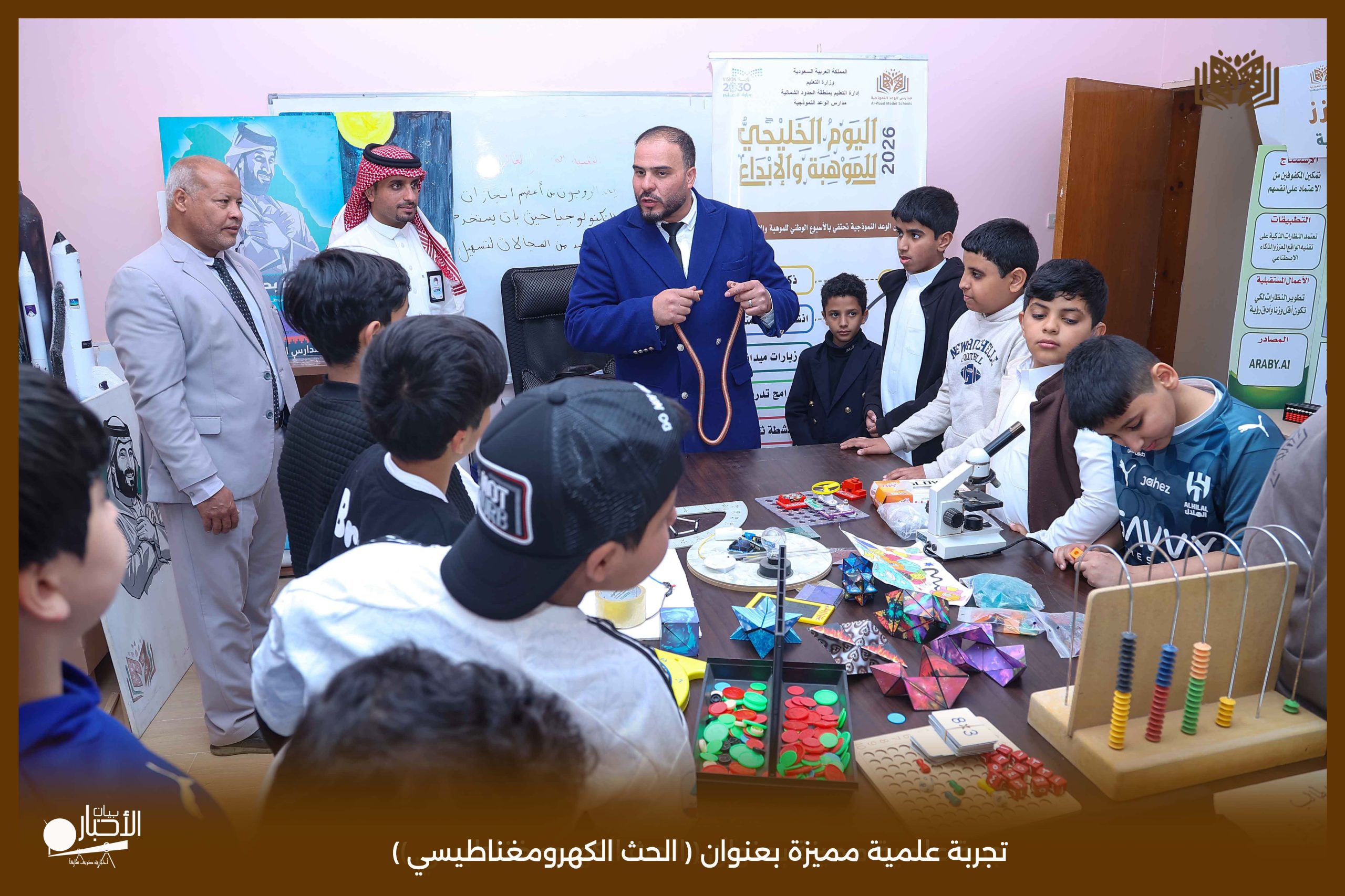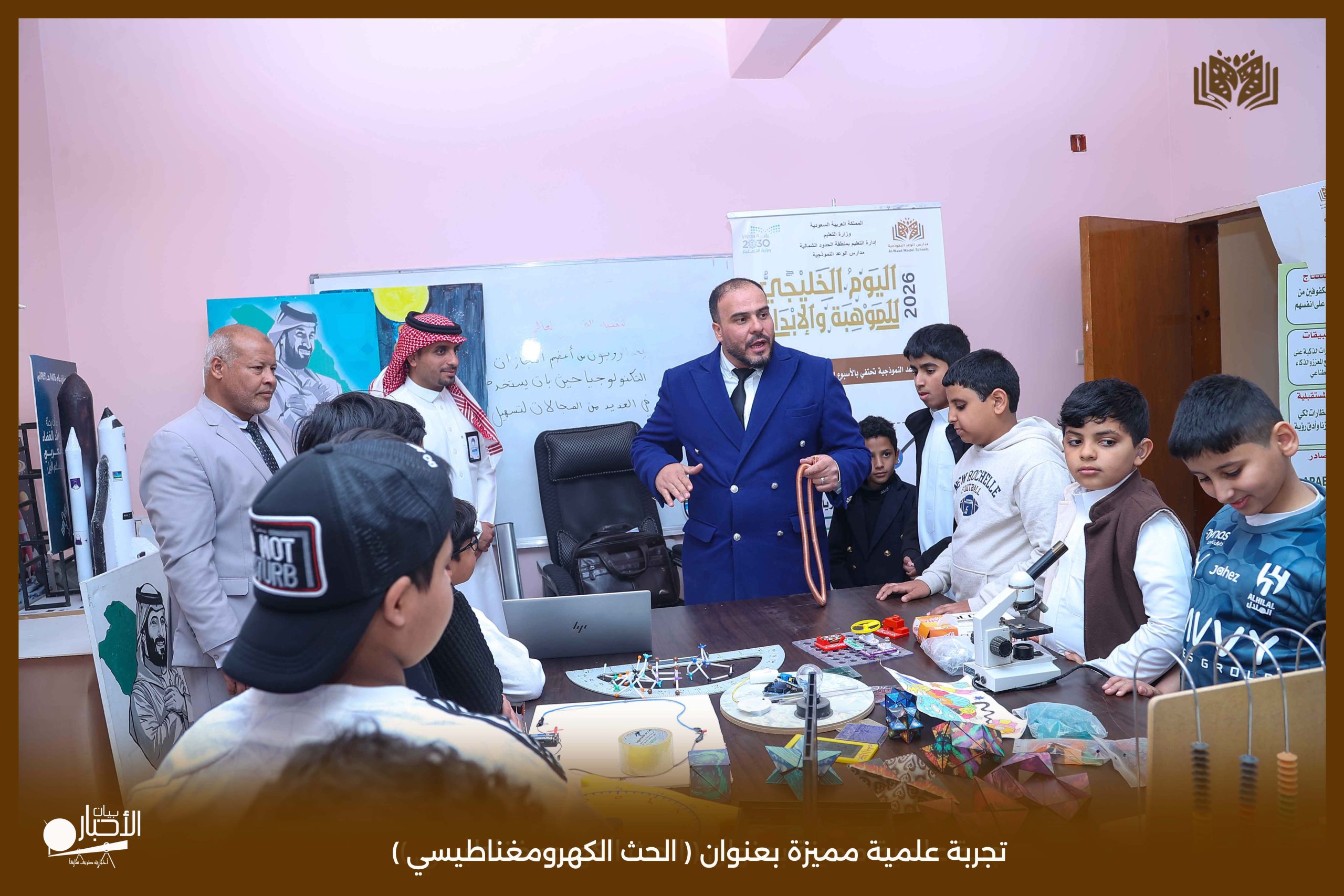 نفذت ابتدائية الوعد النموذجية تجربة علمية مميزة بعنوان ( الحث الكهرومغناطيسي ) وذلك ضمن خطة النشاط العلمي وبرامج الموهوبين، حيث بدأ المعلم التجربة بتعريف الطلاب مفهوم الحث الكهرومغناطيسي وهو توليد تيار كهربائي نتيجة تغير المجال المغناطيسي وهو المبدأ الذي اكتشفه العالم مايكل فاراداي، وخلال التنفيذ قام الطلاب بتحريك المغناطيس داخل الملف وخارجه ملاحظين انحراف مؤشر جهاز القياس مما يدل على توليد تيار كهربائي.