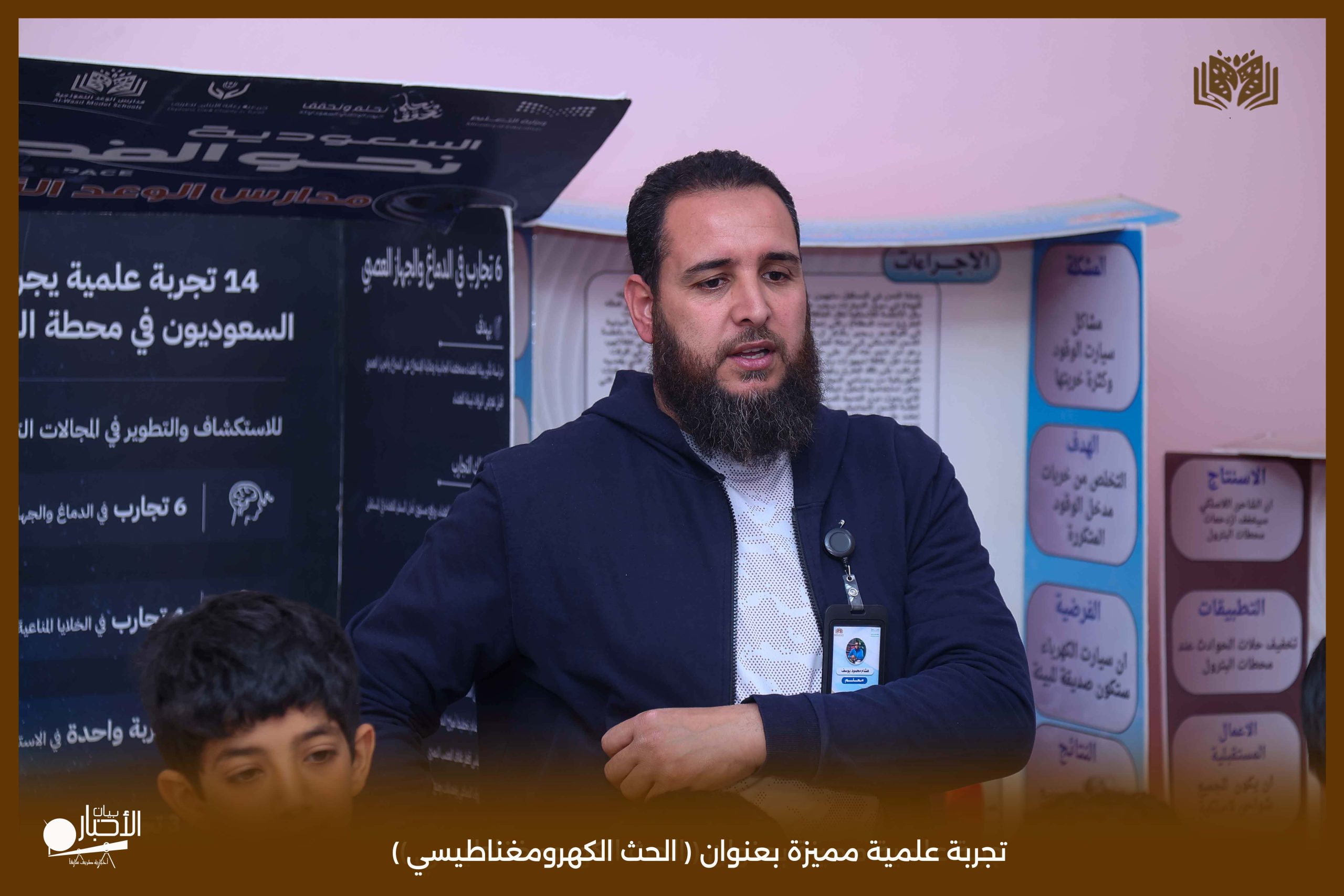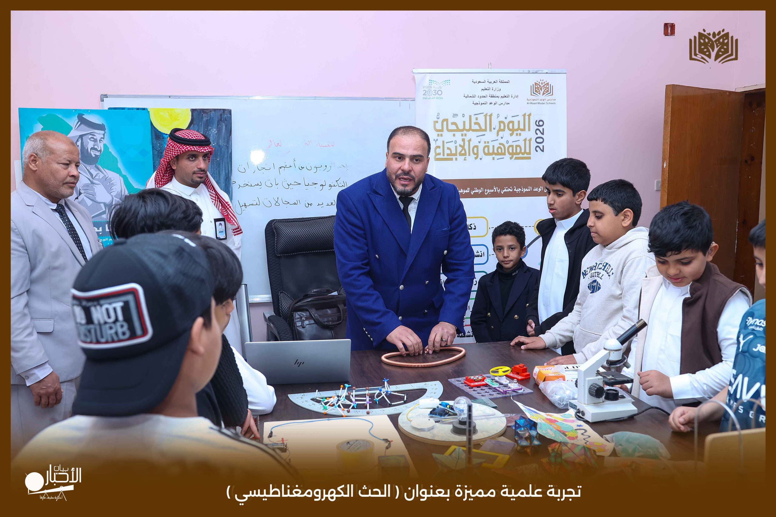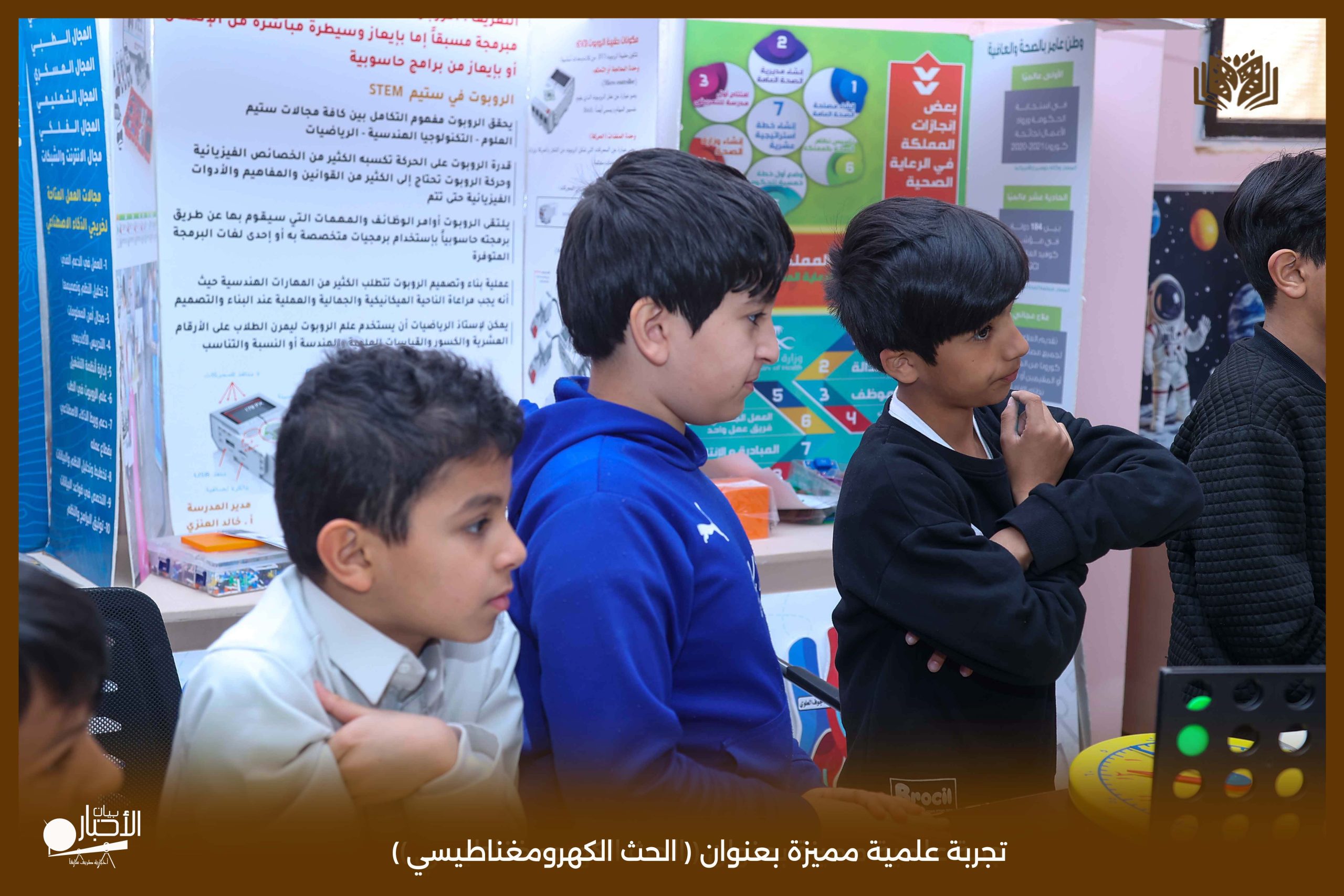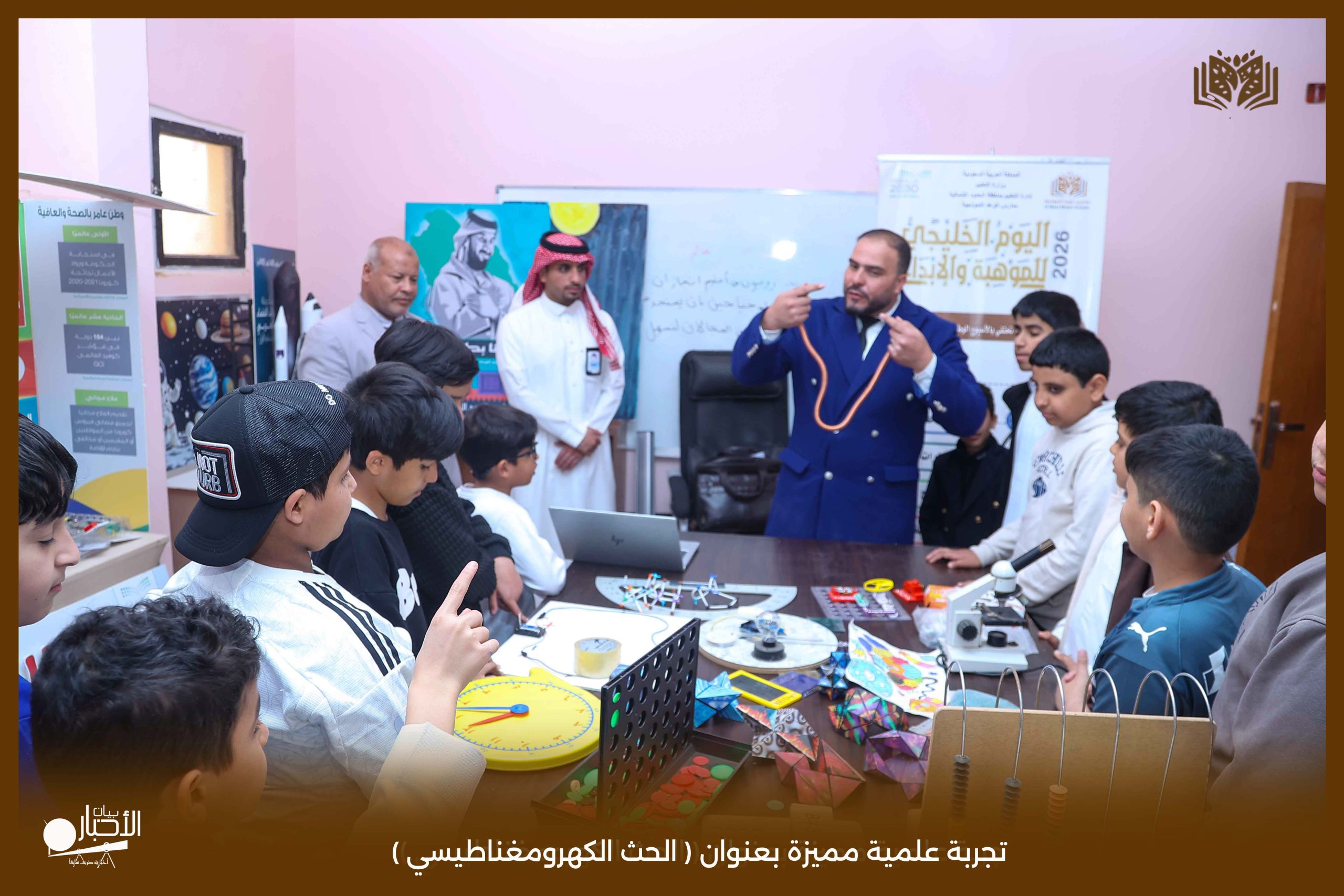 نفذت ابتدائية الوعد النموذجية تجربة علمية مميزة بعنوان ( الحث الكهرومغناطيسي ) وذلك ضمن خطة النشاط العلمي وبرامج الموهوبين، حيث بدأ المعلم التجربة بتعريف الطلاب مفهوم الحث الكهرومغناطيسي وهو توليد تيار كهربائي نتيجة تغير المجال المغناطيسي وهو المبدأ الذي اكتشفه العالم مايكل فاراداي، وخلال التنفيذ قام الطلاب بتحريك المغناطيس داخل الملف وخارجه ملاحظين انحراف مؤشر جهاز القياس مما يدل على توليد تيار كهربائي.