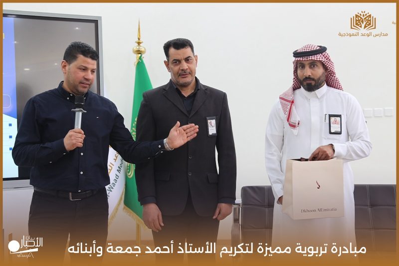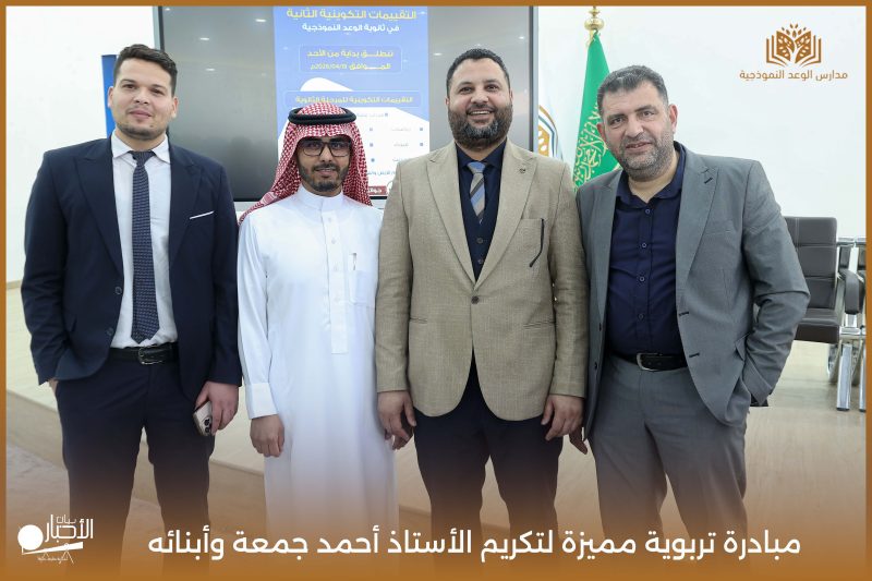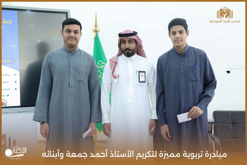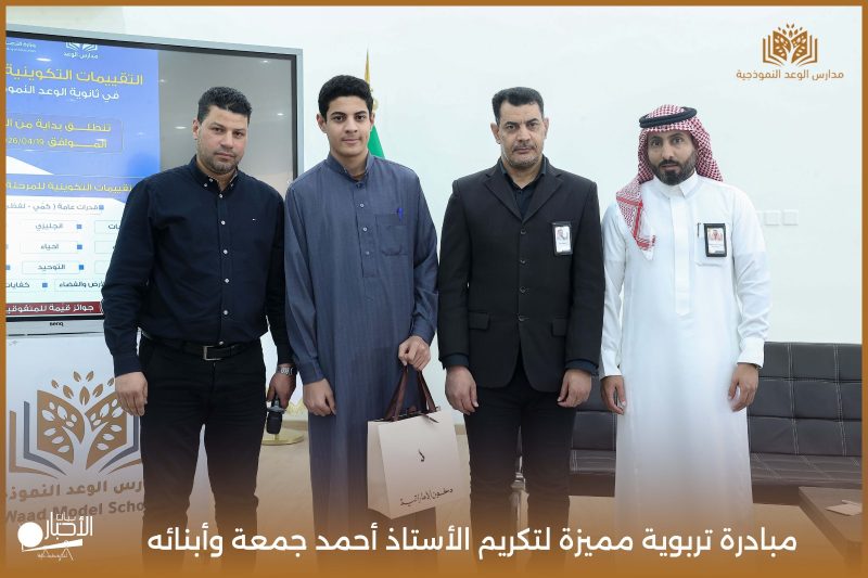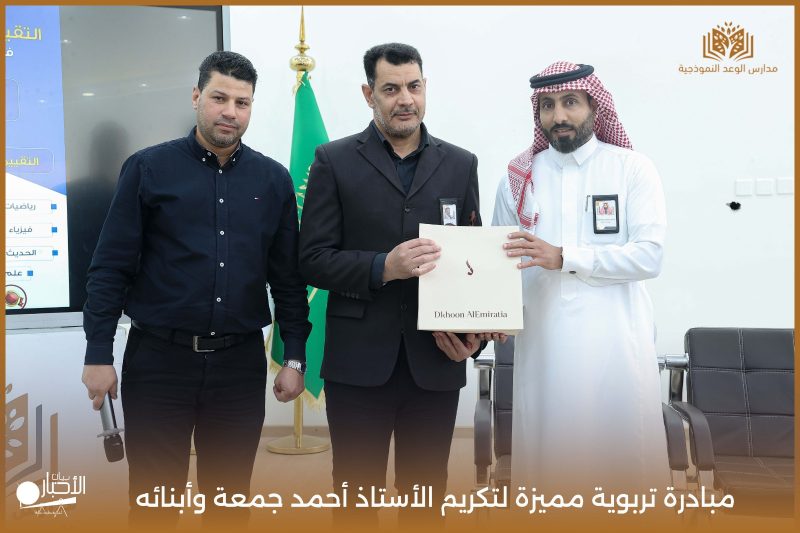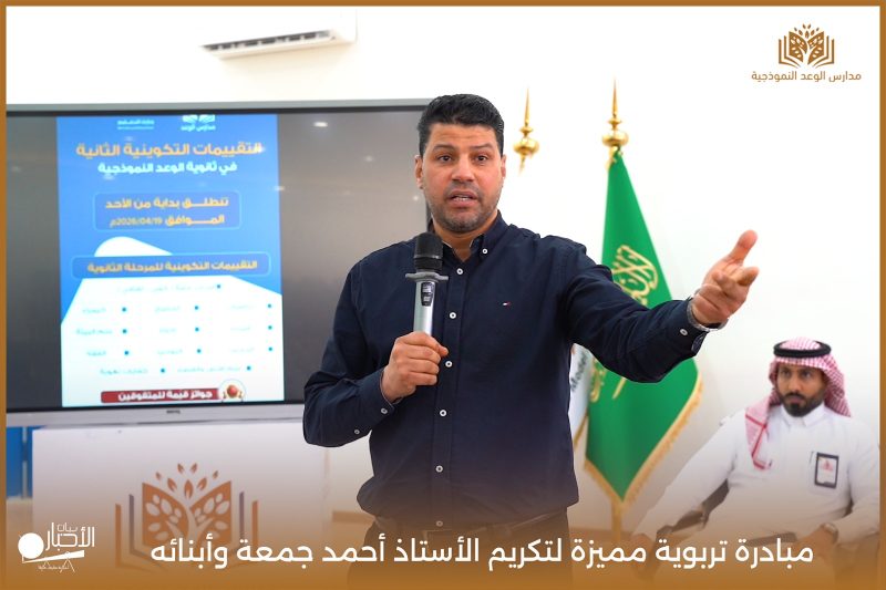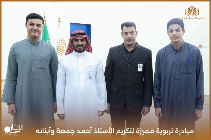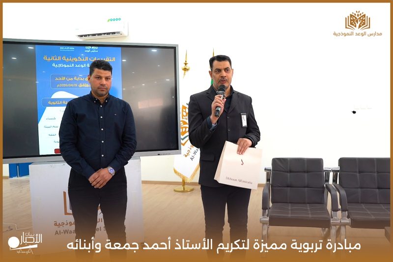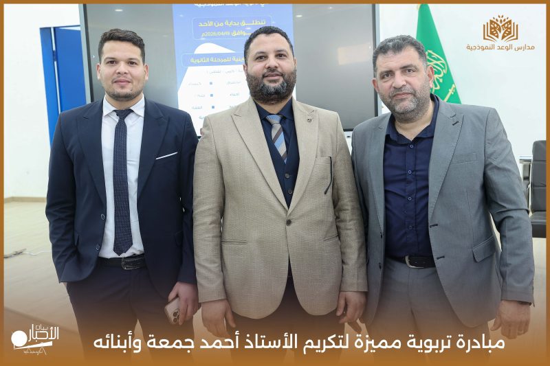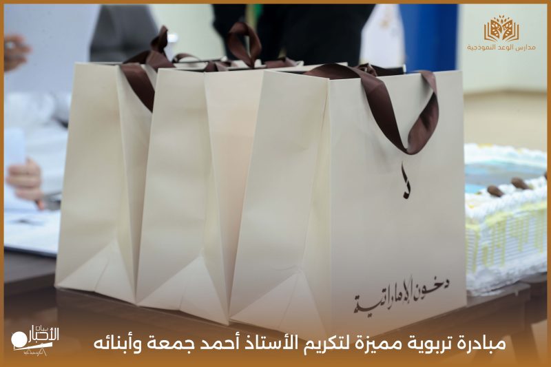 قامت مدارس الوعد النموذجية اليوم الأحد الموافق 19 / 4 / 2026م مبادرة تربوية مميزة لتكريم الأستاذ أحمد جمعة وأبنائه من طلاب المدرسة محمد أحمد جمعة ويوسف أحمد جمعة، وذلك بمناسبة إتمامهم حفظ كتاب الله الكريم، في لفتة تعكس اهتمام المدرسة بتعزيز القيم الإيمانية وتحفيز أبنائها على التميز في حفظ القرآن الكريم.