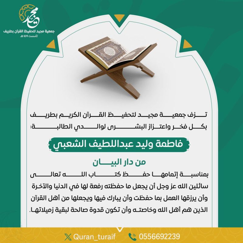 احتفت جمعية مجيد لتحفيظ القرآن الكريم بمحافظة طريف بإتمام عدد من الطالبات حفظ كتاب الله الكريم، وذلك في أجواء إيمانية مفعمة بالفخر والاعتزاز، تأكيدًا على رسالتها في خدمة القرآن الكريم وأهله.