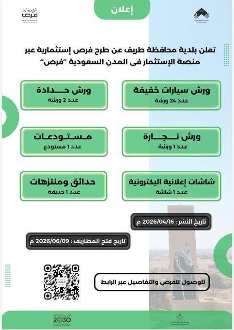 وأوضحت البلدية أن تاريخ نشر الفرص هو 16 أبريل 2026، على أن يكون موعد فتح المظاريف في 9 يونيو 2026، داعيةً المستثمرين إلى الاطلاع على التفاصيل والتقديم عبر الرابط