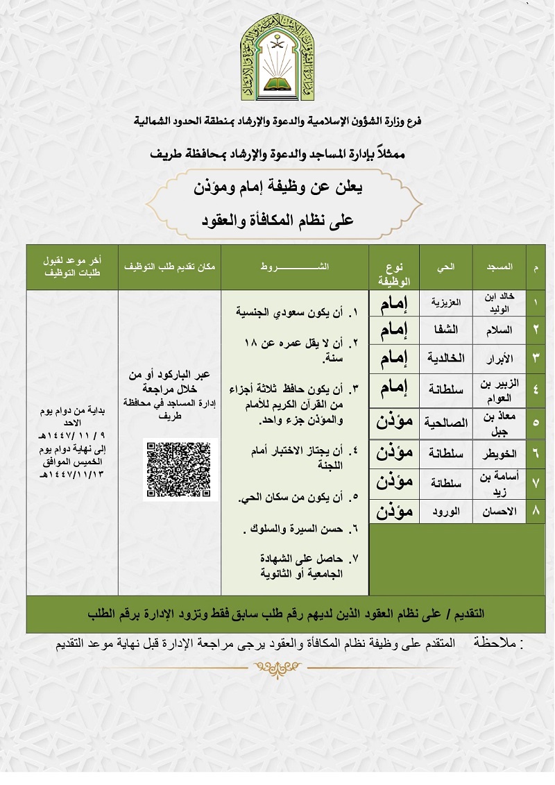 أعلن فرع وزارة الشؤون الإسلامية والدعوة والإرشاد بمنطقة الحدود الشمالية ممثلاً بإدارة المساجد والدعوة والإرشاد بمحافظة طريف عن وظيفة إمام ومؤذن على نظام العقود والمكافأة بعدد من مساجد المحافظة .