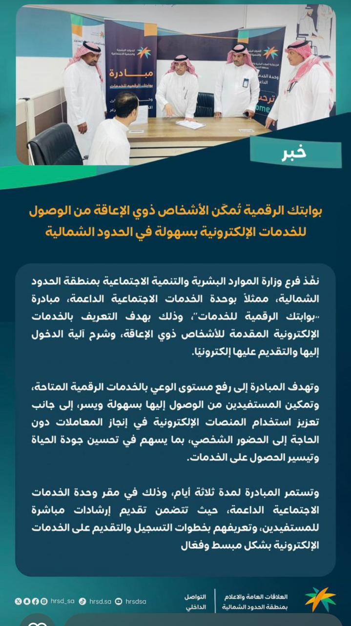 نفّذ فرع وزارة الموارد البشرية والتنمية الاجتماعية بمنطقة الحدود الشمالية، ممثلاً بوحدة الخدمات الاجتماعية الداعمة، مبادرة “بوابتك الرقمية للخدمات”، وذلك بهدف التعريف بالخدمات الإلكترونية المقدمة للأشخاص ذوي الإعاقة، وشرح آلية الدخول إليها والتقديم عليها إلكترونياً.