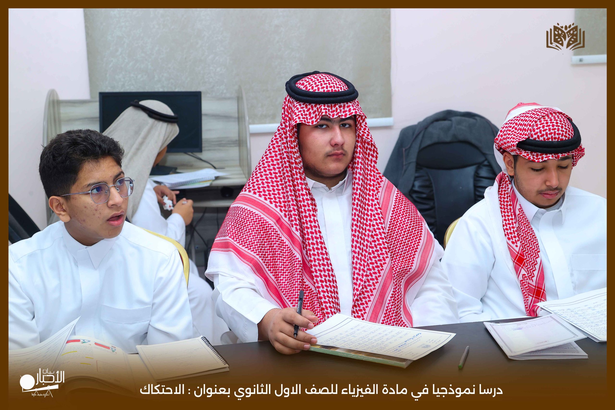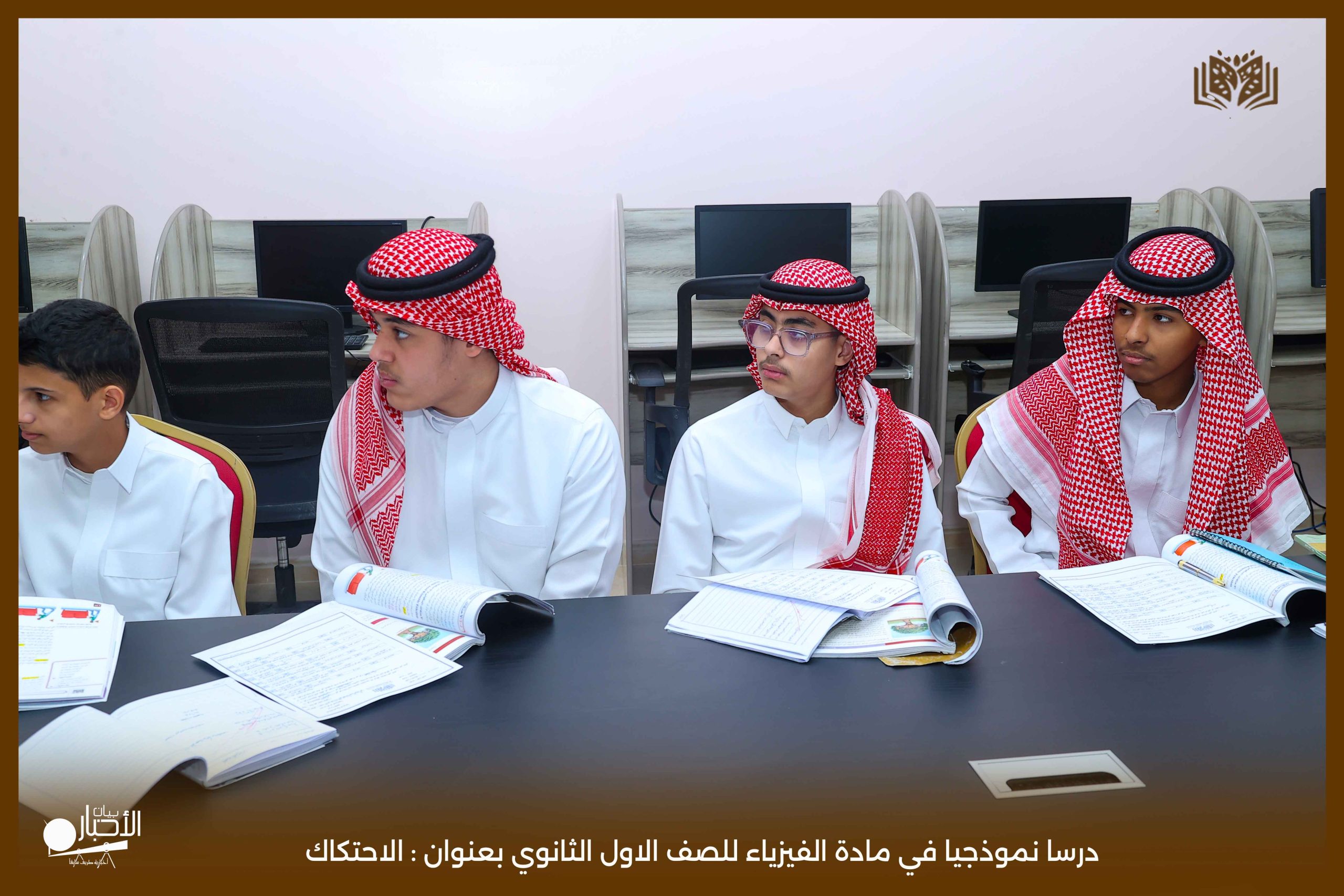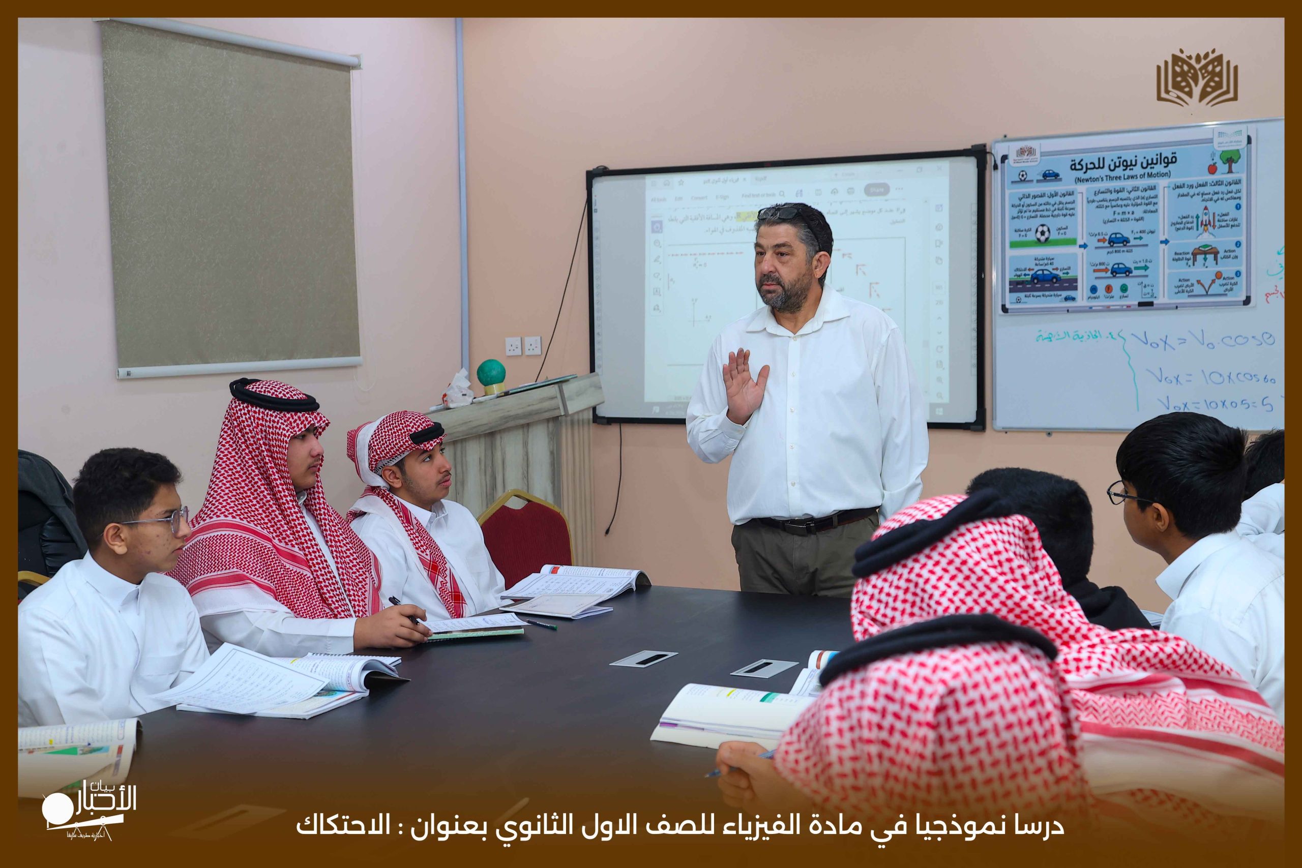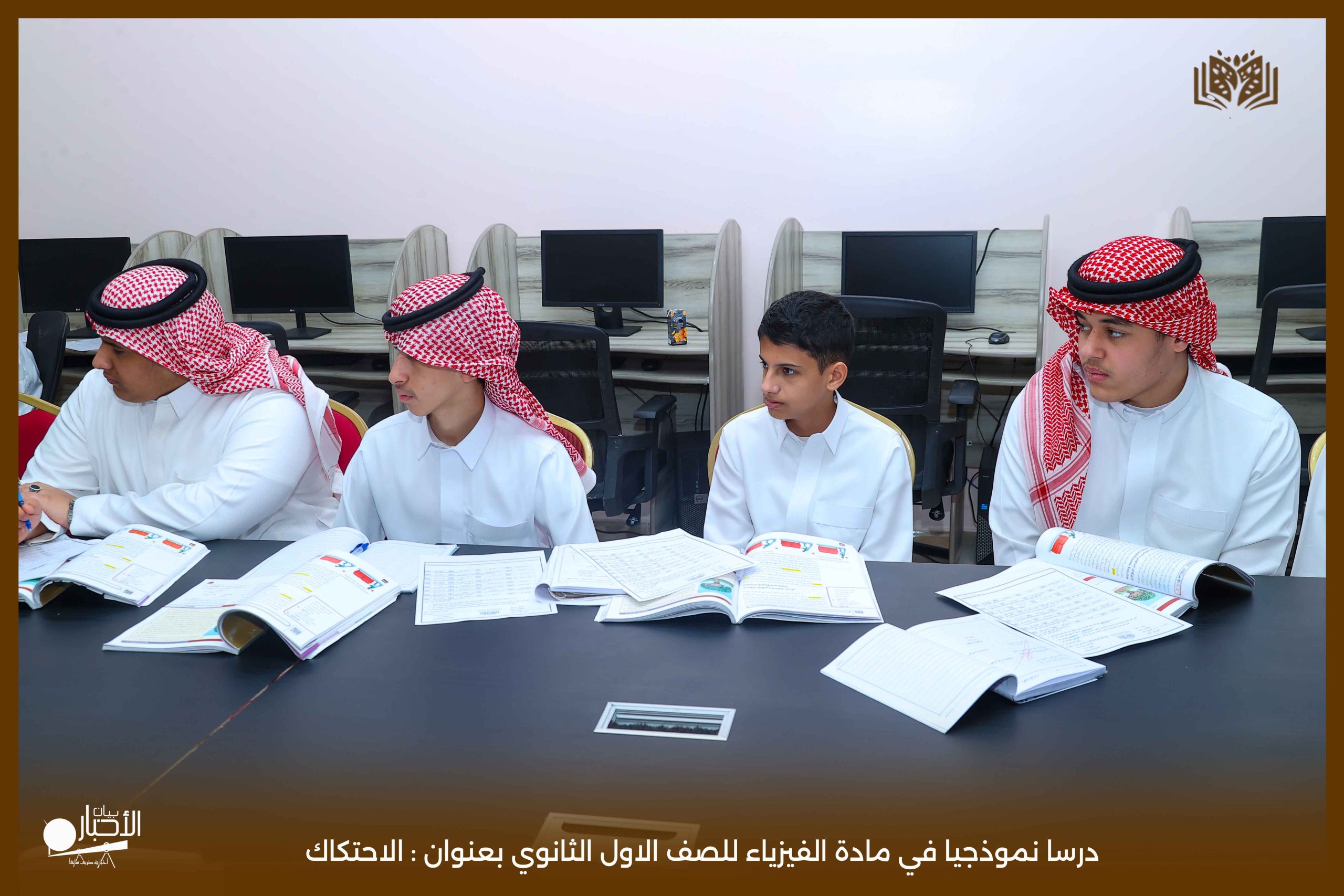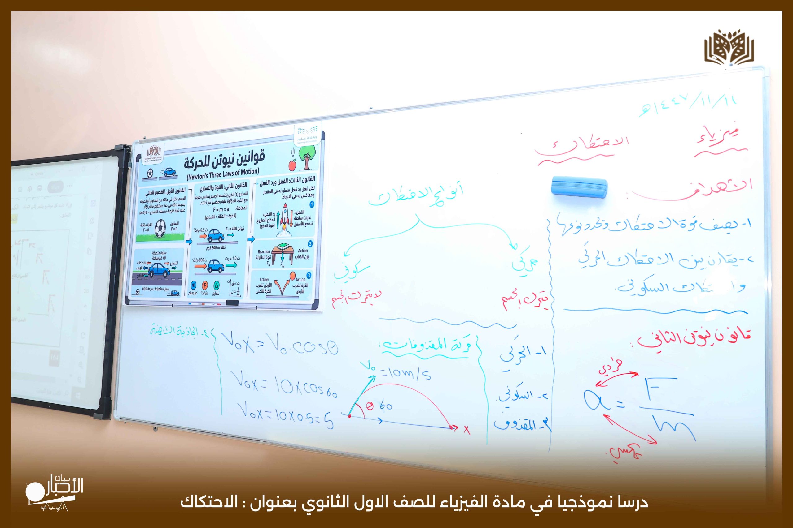 شهدت مدارس الوعد النموذجية بمحافظة طريف، يوم الثلاثاء 11 / 11 / 1447هـ، تنفيذ درس نموذجي في مادة الفيزياء للصف الأول الثانوي بعنوان “الاحتكاك”.